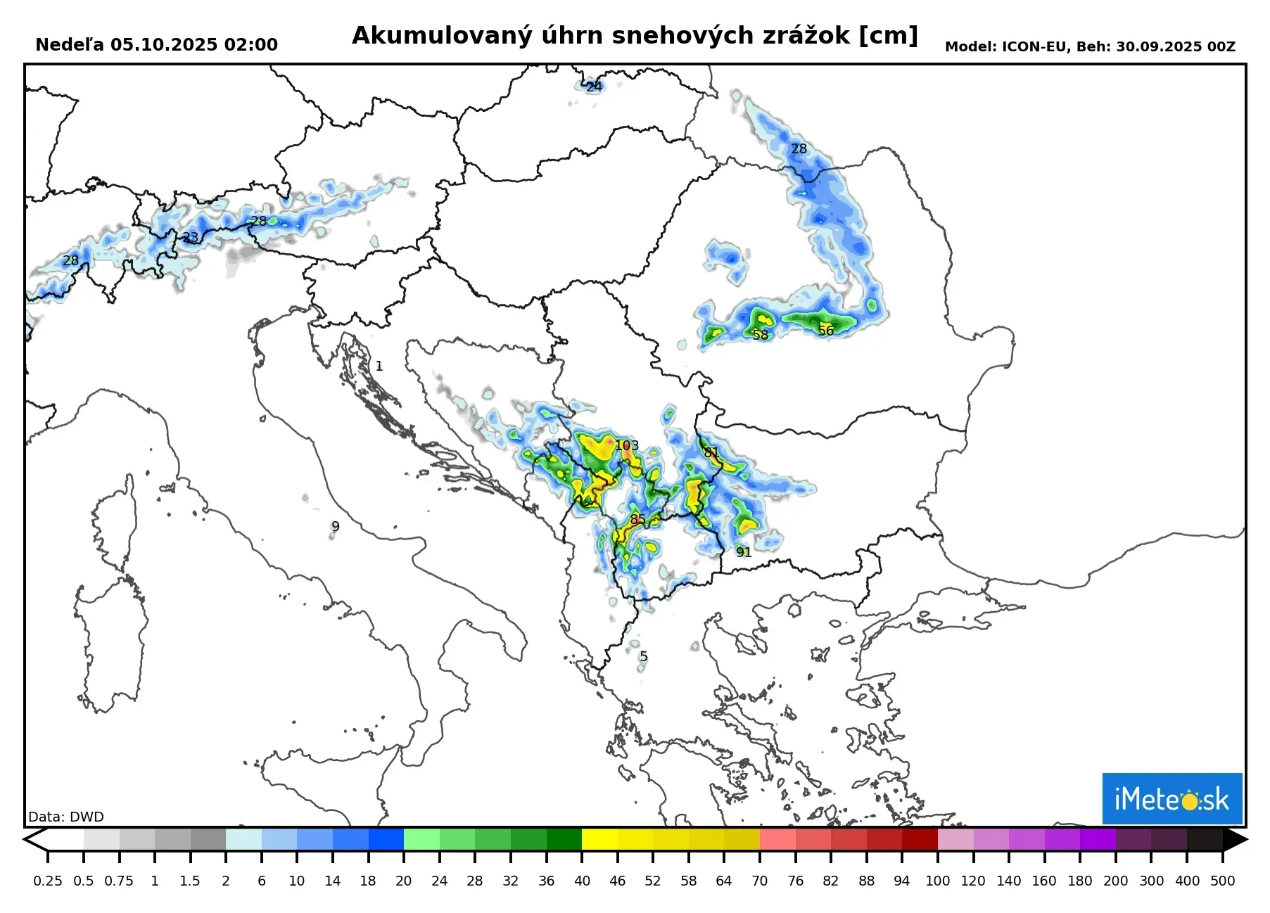 Najviac snehu napadne do nedele v Srbsku, kde to môže byť až 100 cm. Vysoké úhrny nad 50 cm čakajú viaceré balkánske štáty ako Bosnu a Hercegovinu, Macedónsko či Bulharsko. Do 50 cm nasneží aj na horách v Rumunsku.