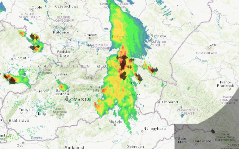 Búrky sa dnes na východe doslova zliali do jednej plošnej zrážkovej oblačnosti, ktorá postupuje na juh, resp. juhovýchod.