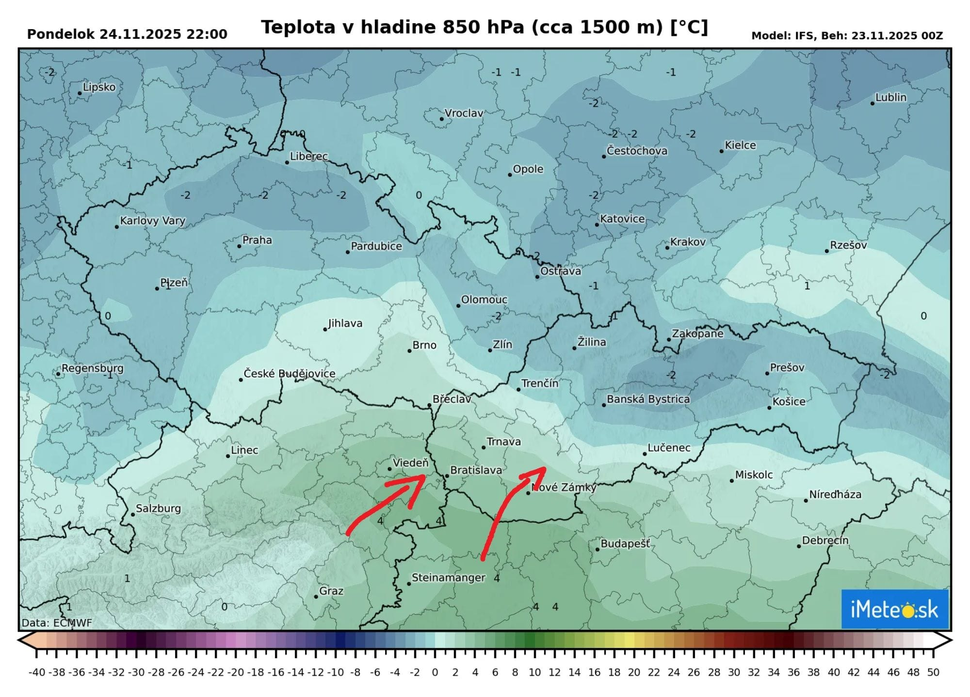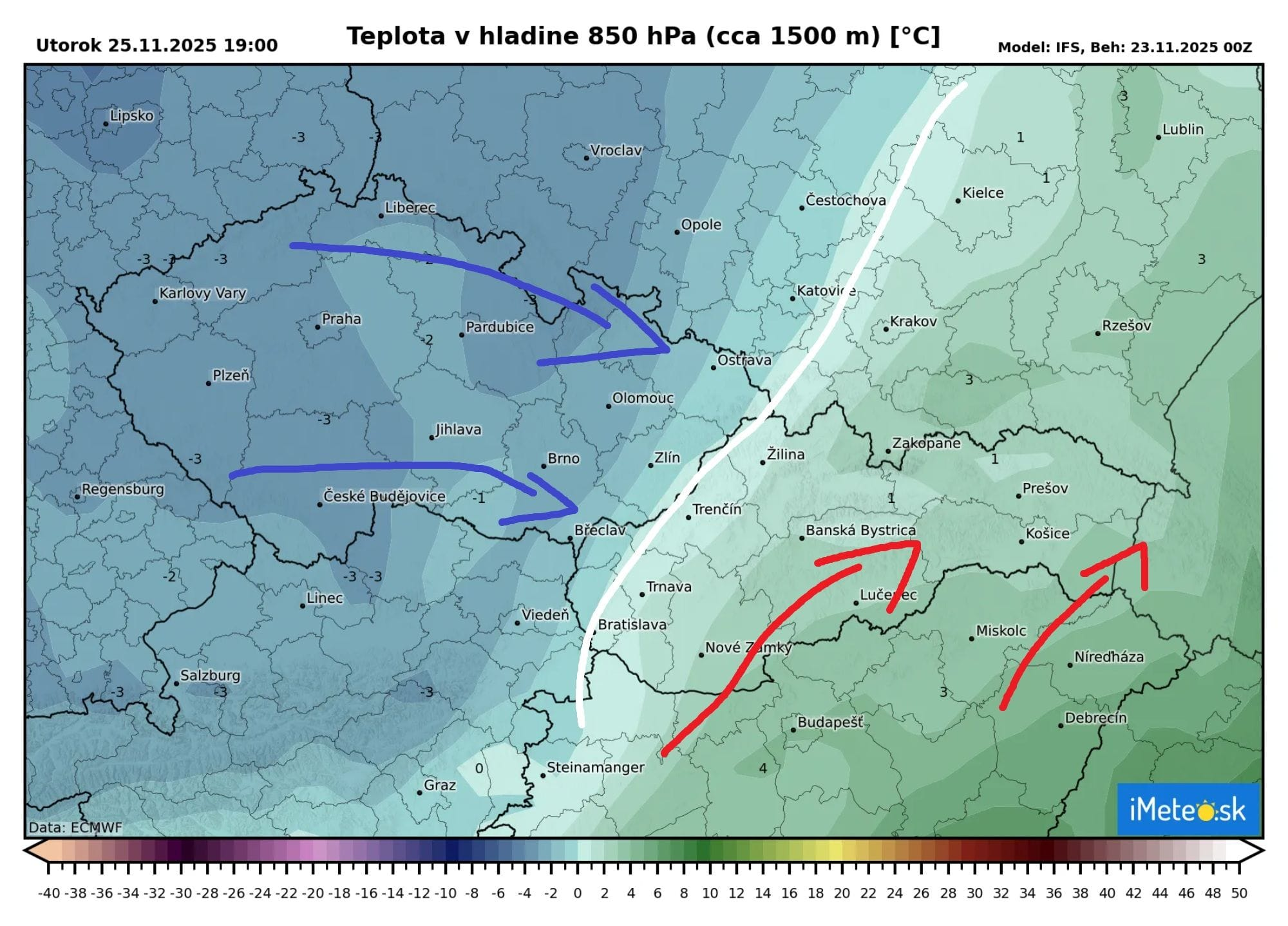 Oveľa zaujímavejšie to však vyzerá na utorok, kedy by cez Moravu a Záhorie malo postupovať výrazné teplotné rozhranie. To by do Rakúska a do Česka malo prinášať výrazné sneženie, no naše územie by malo zostať v teplejšom vzduchu.