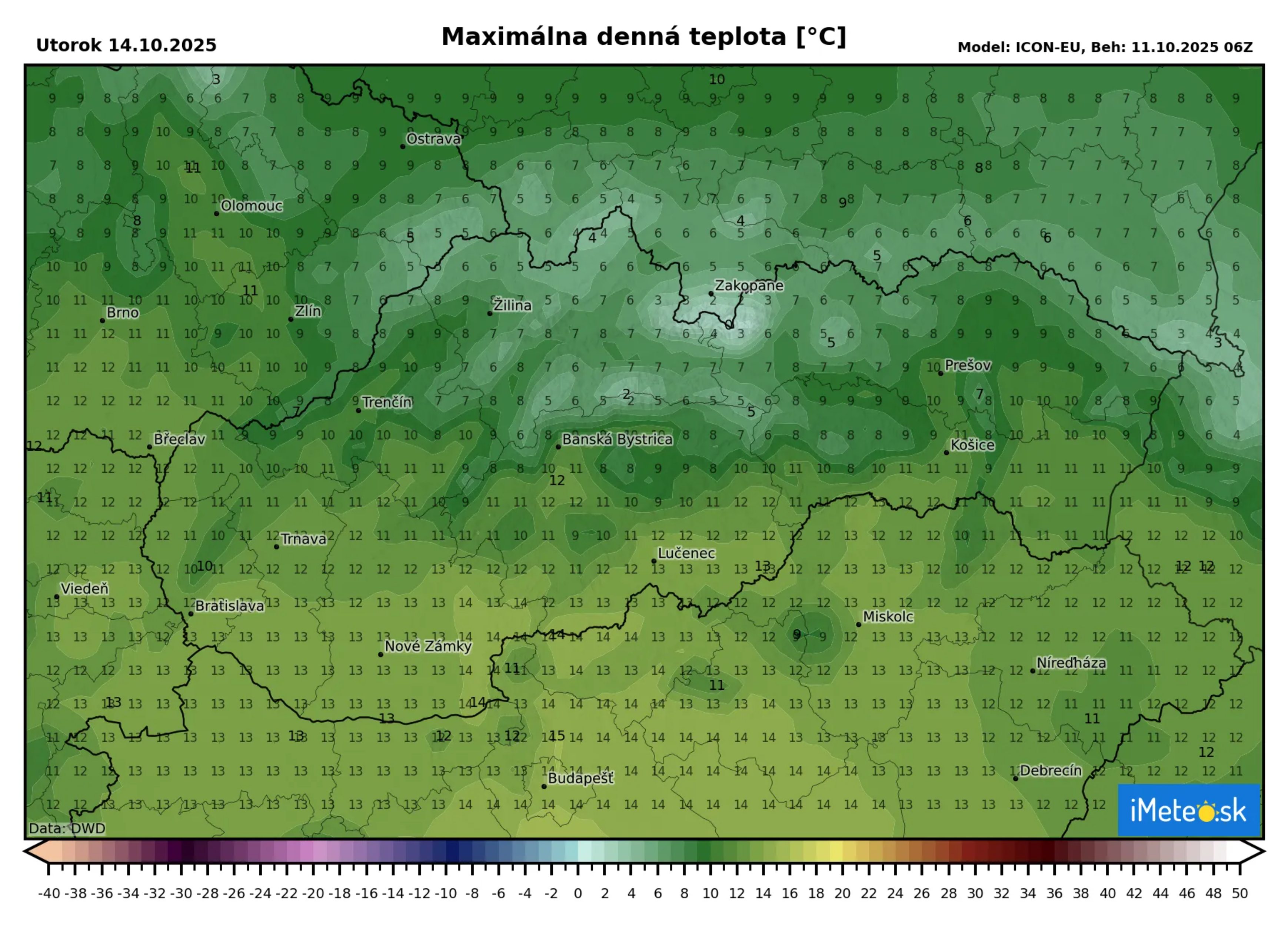 Príliv chladného vzduchu by mal nad naše územie pokračovať aj v nasledujúcich dňoch a tak sa maximálne teploty budú aj naďalej udržiavať pod hranicou +15 °C.