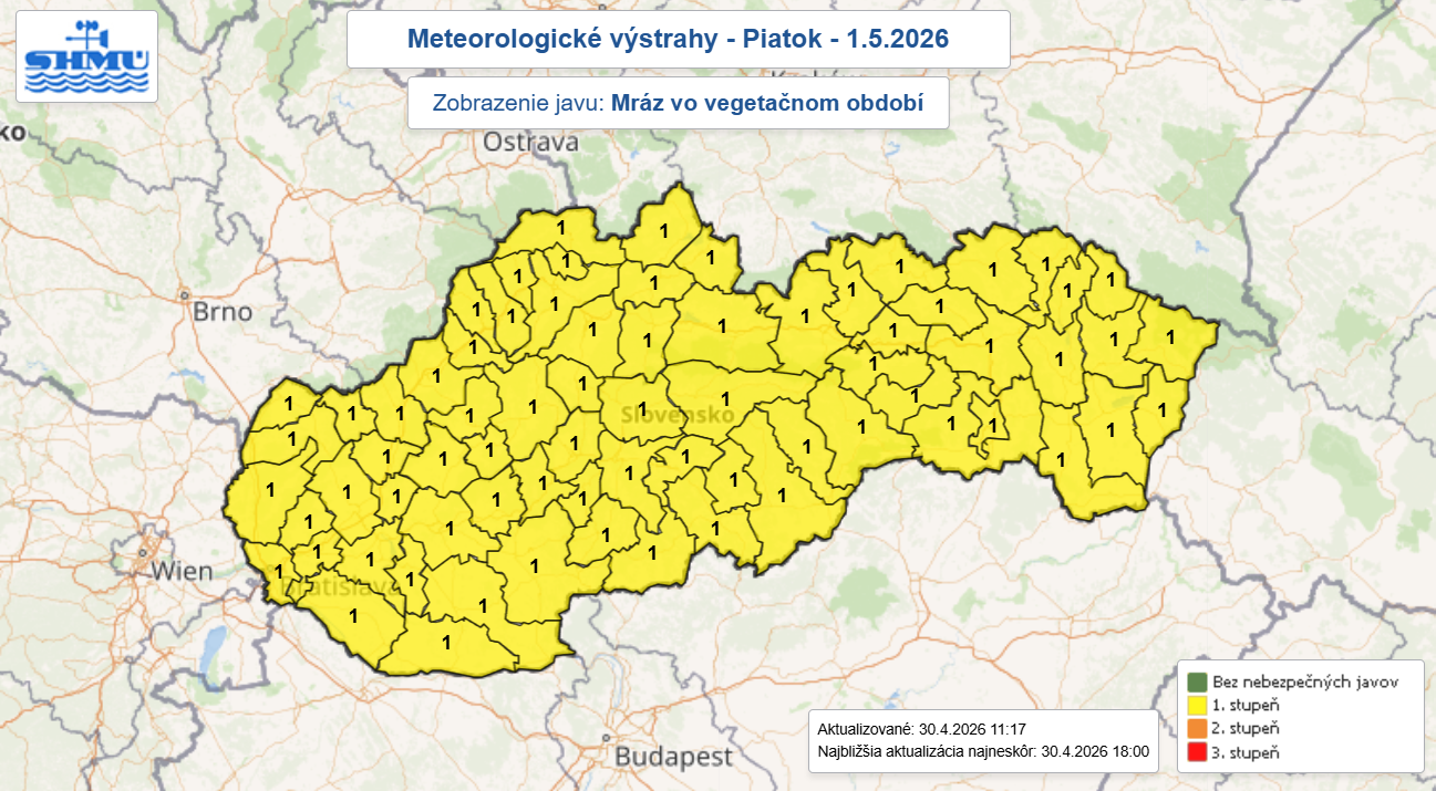 V súvislosti s očakávaným poklesom nočných teplôt vydal Slovenský hydrometeorologický ústav výstrahu prvého stupňa pred mrazom vo vegetačnom období. Táto výstraha platí pre celé územie Slovenska v čase od 30. apríla 2026 od 23:00 h do 1. mája 2026 do 07:00 h, čo znamená, že riziko poškodenia vegetácie sa týka všetkých regiónov krajiny.