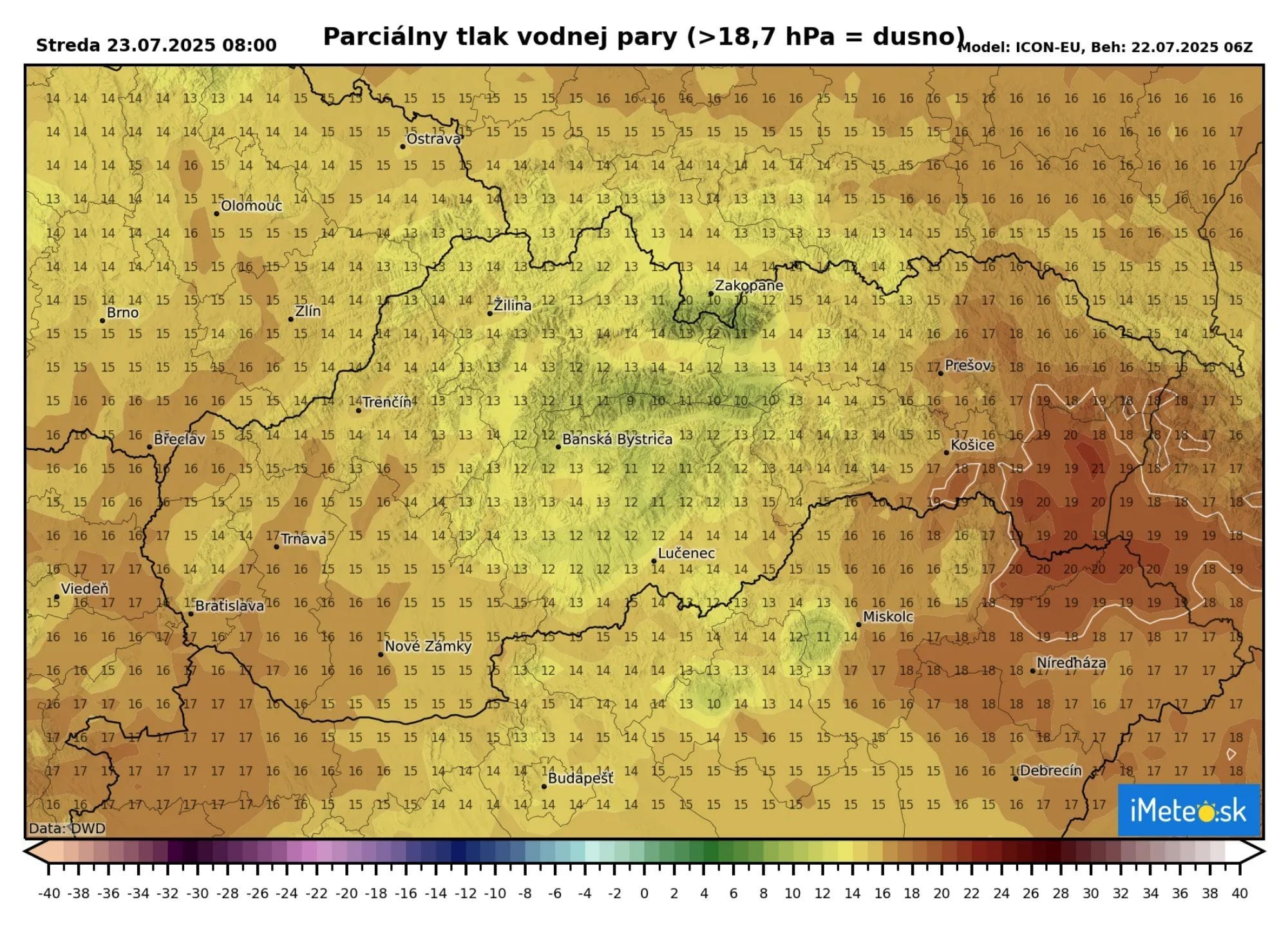 Najvýraznejšie dusno očakávame na východnom Slovensku, a to najmä v dopoludňajších hodinách. Hodnoty parciálneho tlaku vodnej pary sa budú pohybovať aj okolo 20 hPa.