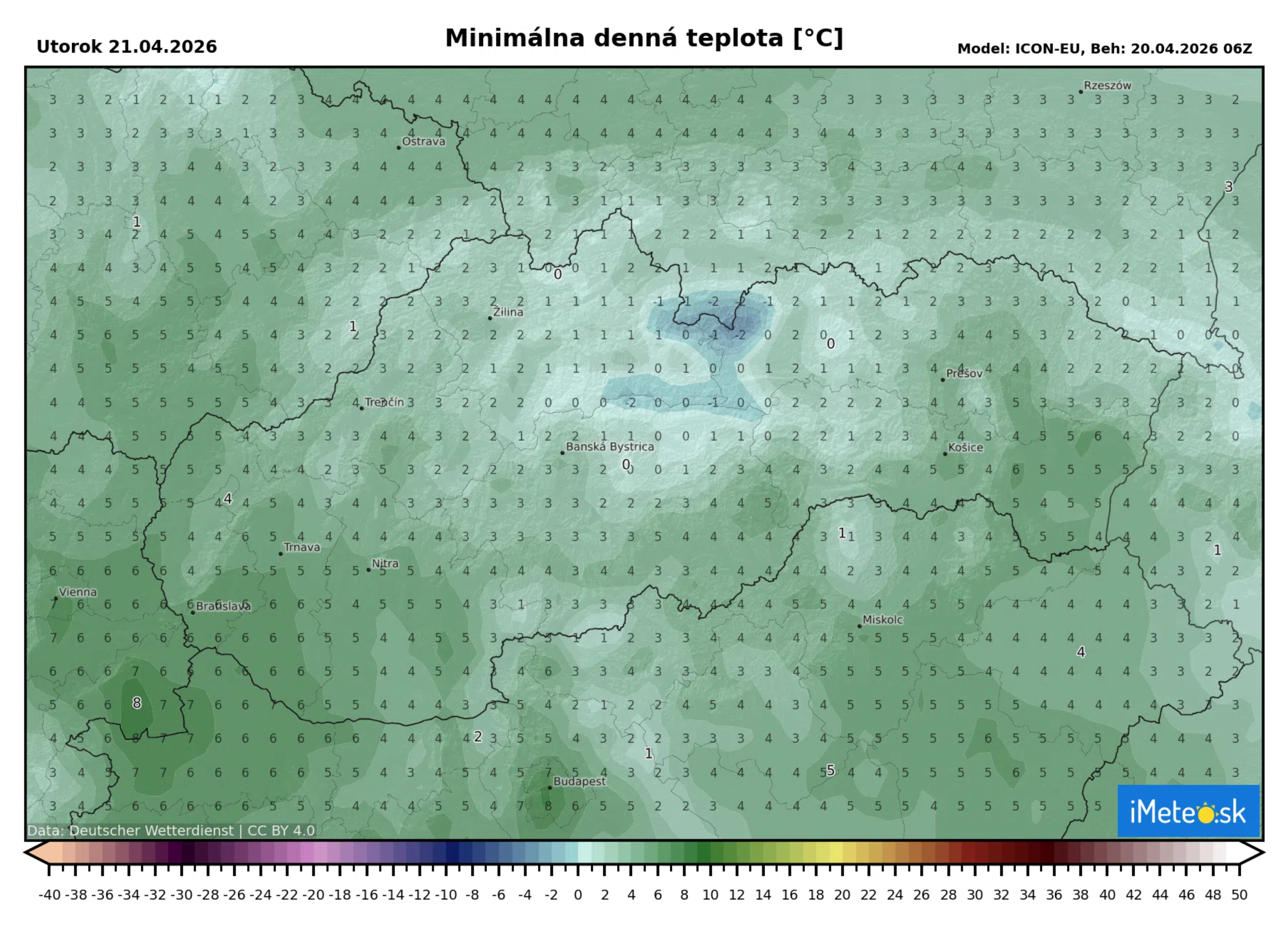 Najnižšia nočná teplota klesne na hodnoty od +7 do +2 °C, pričom lokálne, najmä v dolinách a údoliach severného Slovenska, sa teplota môže znížiť na +2 až -3 °C. V takýchto podmienkach môže dochádzať k tvorbe poľadovice, najmä tam, kde sa zrážky vyskytnú pri teplotách blízkych bodu mrazu.