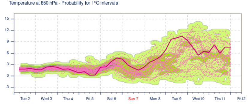 V hladine 850 hPa, ktorá je dôležitá pre skupenstvo zrážok a opisuje nám to, aká vzduchová hmota bude k nám prúdiť, je rozptyl obrovský. Interval spoľahlivosti je až 10 °C a predpoveď toho, či sa oteplí alebo ochladí je na rovnakej pravdepodobnosti.