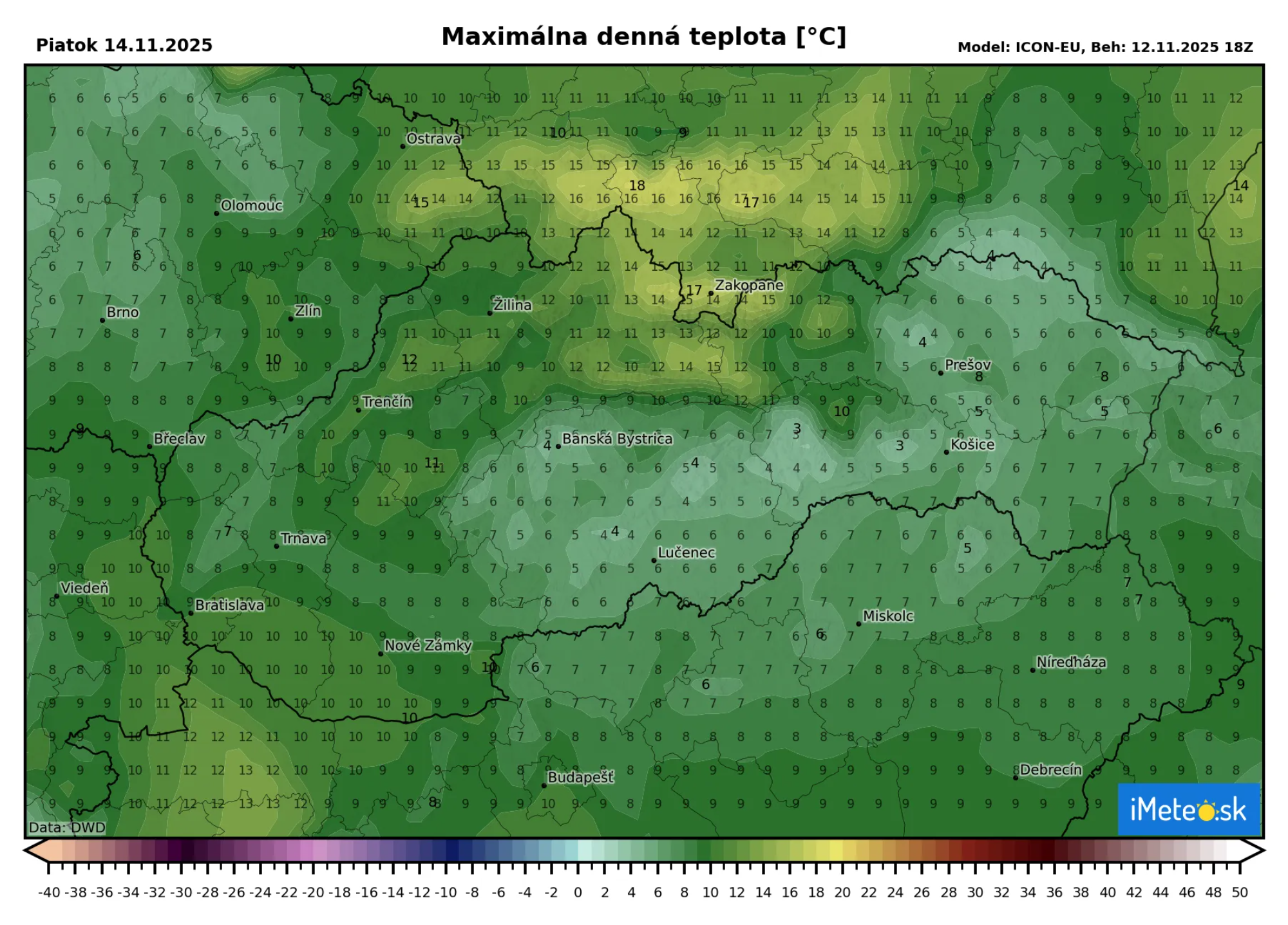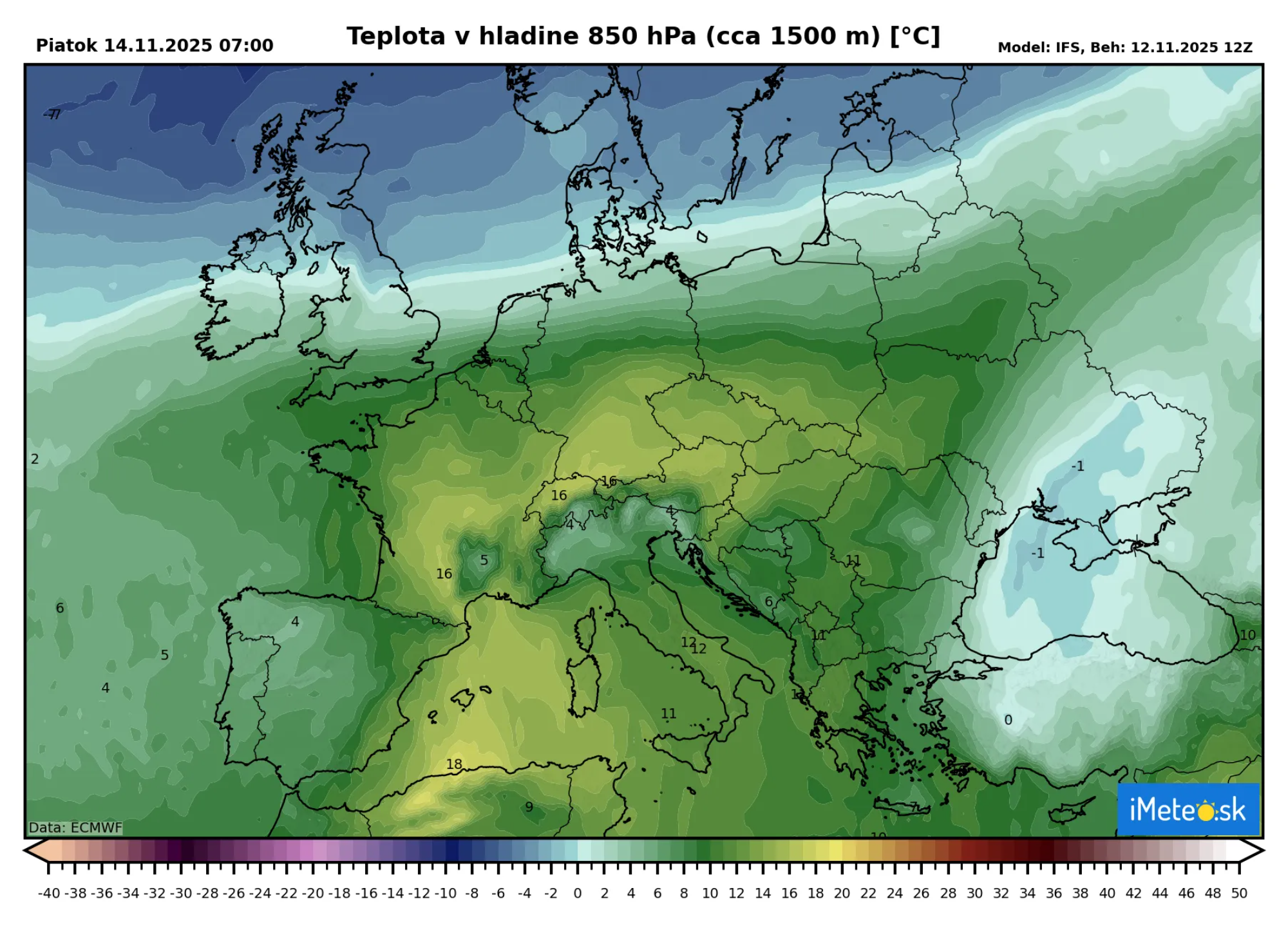 Nad inverznou vrstvou však bude teplejšie. Na miestach, kde sa zmenší oblačnosť by sa mohlo otepliť až na +17 °C. Všimnite si, že na severe by malo byť teplejšie, ako na juhu.