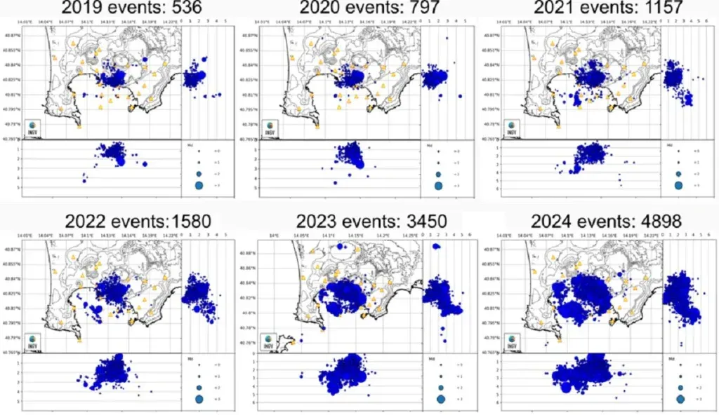 Flegrejské polia sú aktívna sopečná kaldera v blízkosti Neapola, ktorá od druhej polovice roku 2005 vykazuje zreteľné známky nerovnováhy. Objavuje sa zdvíhanie terénu, plytká seizmicita a zvýšené úniky plynov z fumarolických zón. Tento proces, známy ako bradyseizmus, sa od roku 2023 výrazne zintenzívnil, najmä v centrálnej časti kaldery medzi mestami Pozzuoli a Bagnoli.
