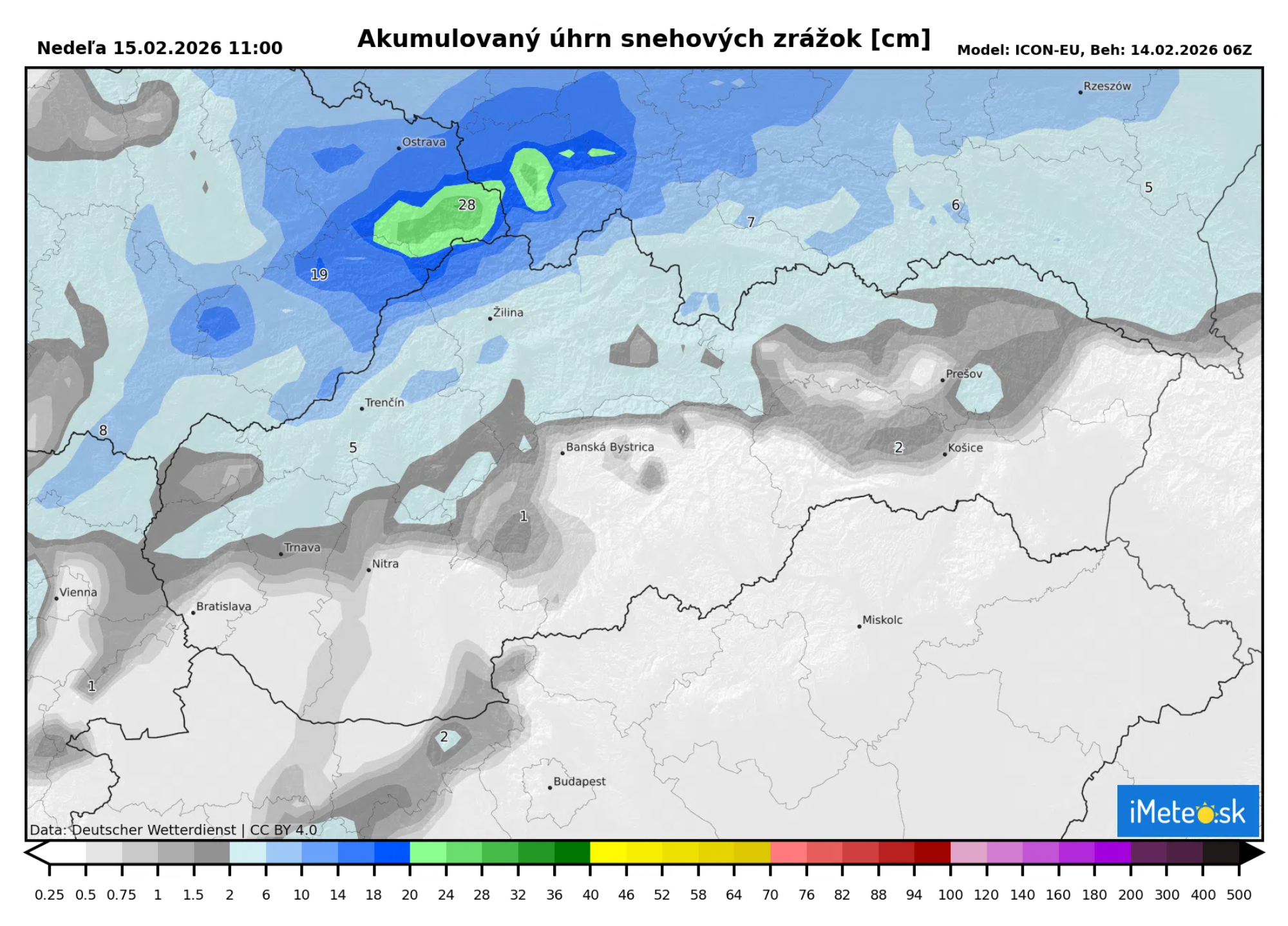 Do nedeľného poludnia môže na viacerých miestach napadnúť približne 10 centimetrov snehu, na severovýchode krajiny aj viac ako 15 centimetrov. Východ Moravskosliezskeho kraja, najmä náveterné svahy Beskýd, môže lokálne zaznamenať aj viac než 25 centimetrov nového snehu.