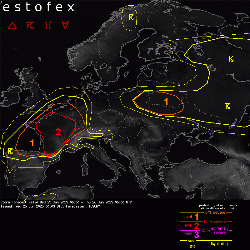 Dnes popoludní (streda, 25. júna 2025) hrozia v rozsiahlej časti Európy silné až extrémne búrky. Meteorológovia upozorňujú, že najvážnejšia situácia nastane vo Francúzsku, kde bol vydaný druhý stupeň výstrahy. Búrky prinesú veľmi veľké krúpy, prudké nárazy vetra a miestami aj riziko tornád.