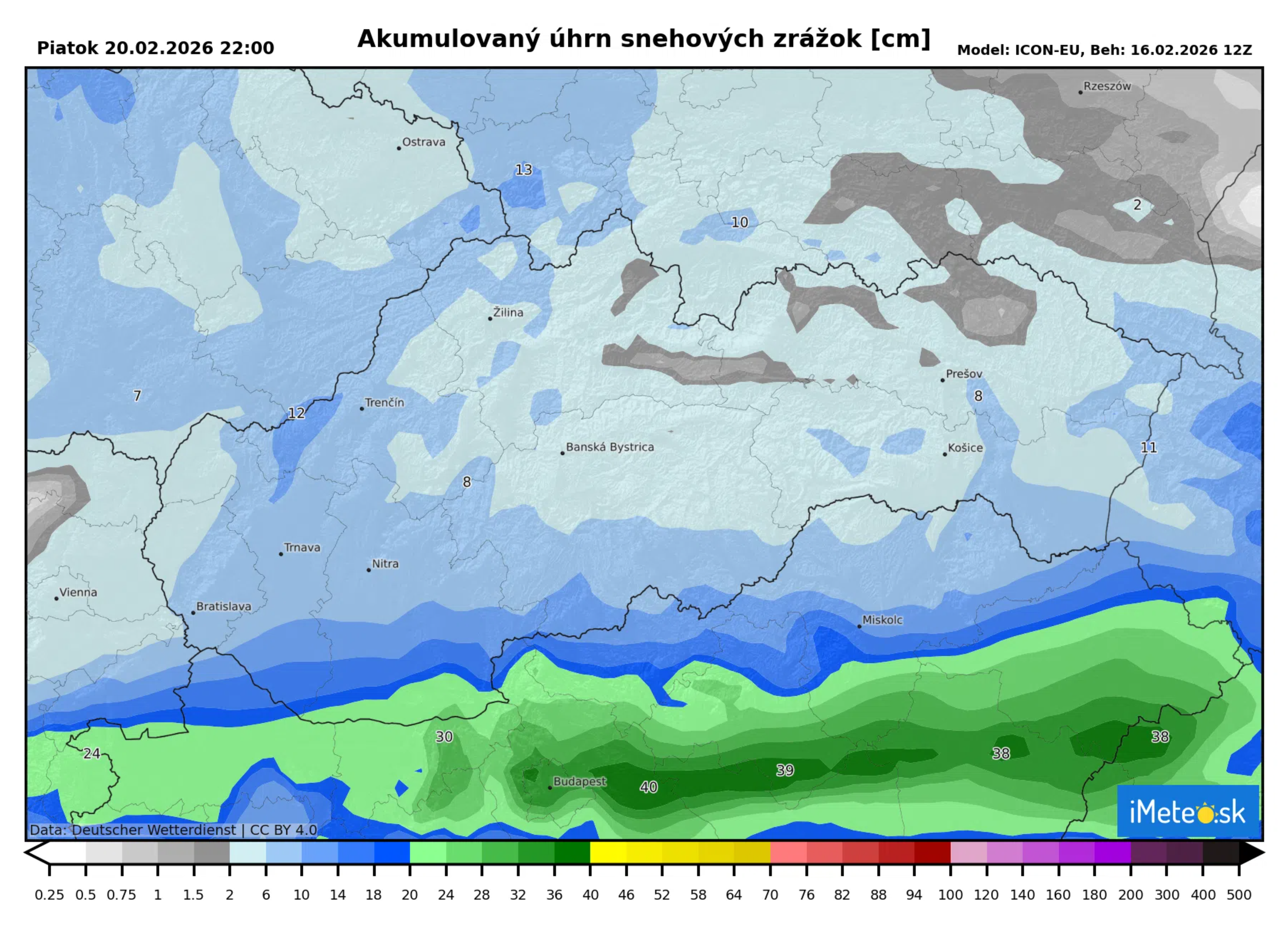 Posledné behy numerických modelov sú však pre potenciálne sneženie priaznivé. Na našom území by mohlo napadnúť od 5 do 15 cm, lokálne až do 25 cm snehu. Najvýdatnejšie zrážky sa očakávajú na juhu územia.