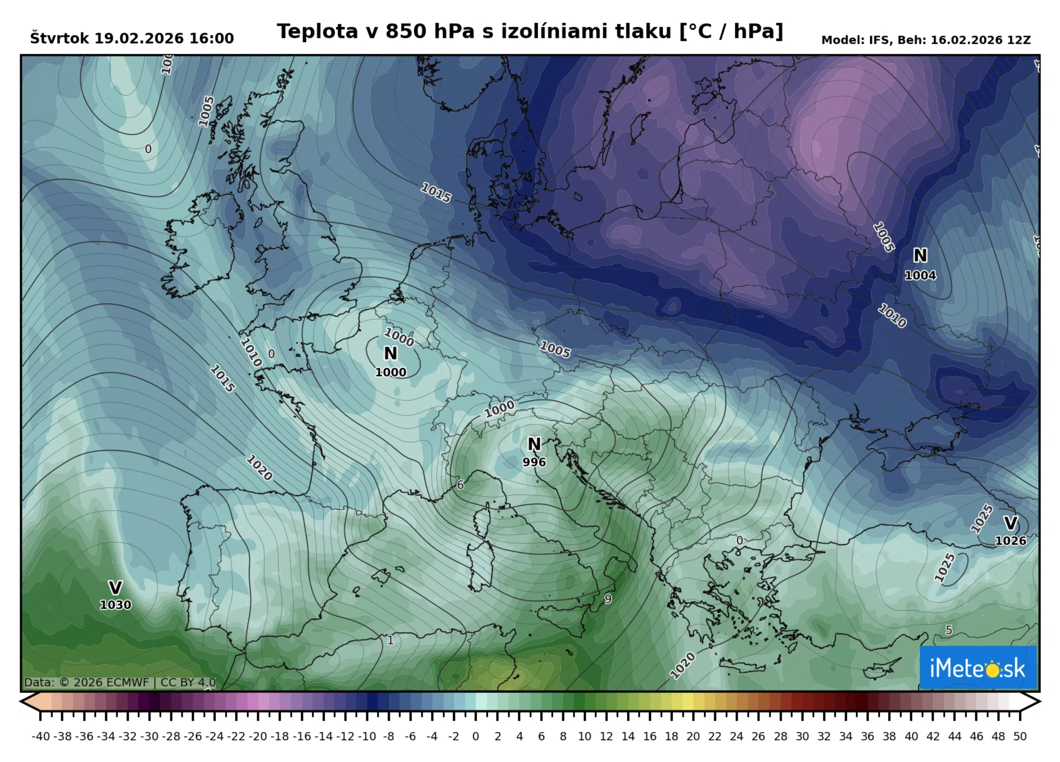 Model ECMWF však teplotné rozhranie očakáva na slovensko-maďarskom pohraničí a na juhu, najmä na juhozápade, by mohlo aj pršať.