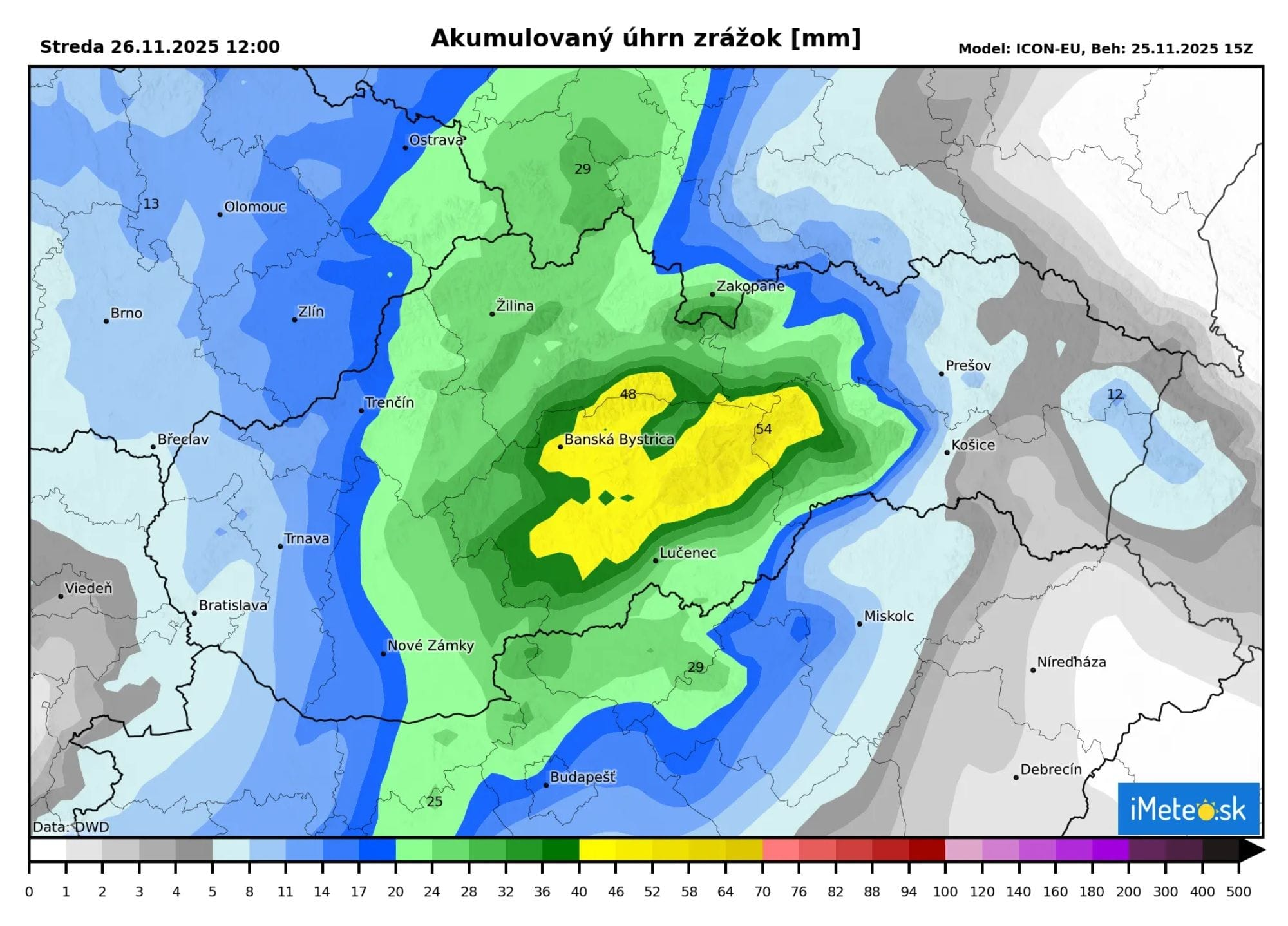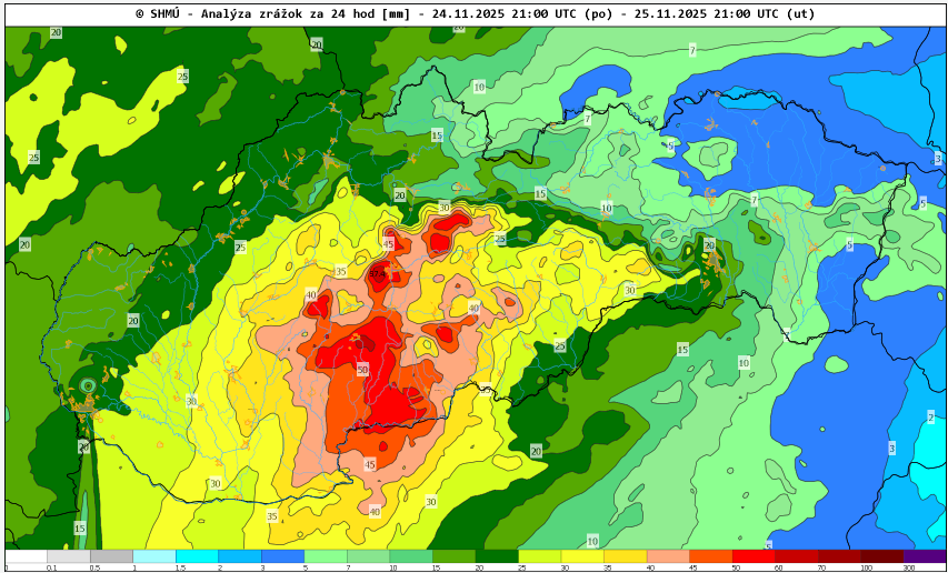 Za uplynulých 24 hodín spadlo v oblasti stredného Slovenska plošne od 40 do 60 mm zrážok. Najvyšší zrážkový úhrn je aktuálne za uplynulých 24 hodín zaznamenaný na Králikoch, kde spadlo 68 mm.