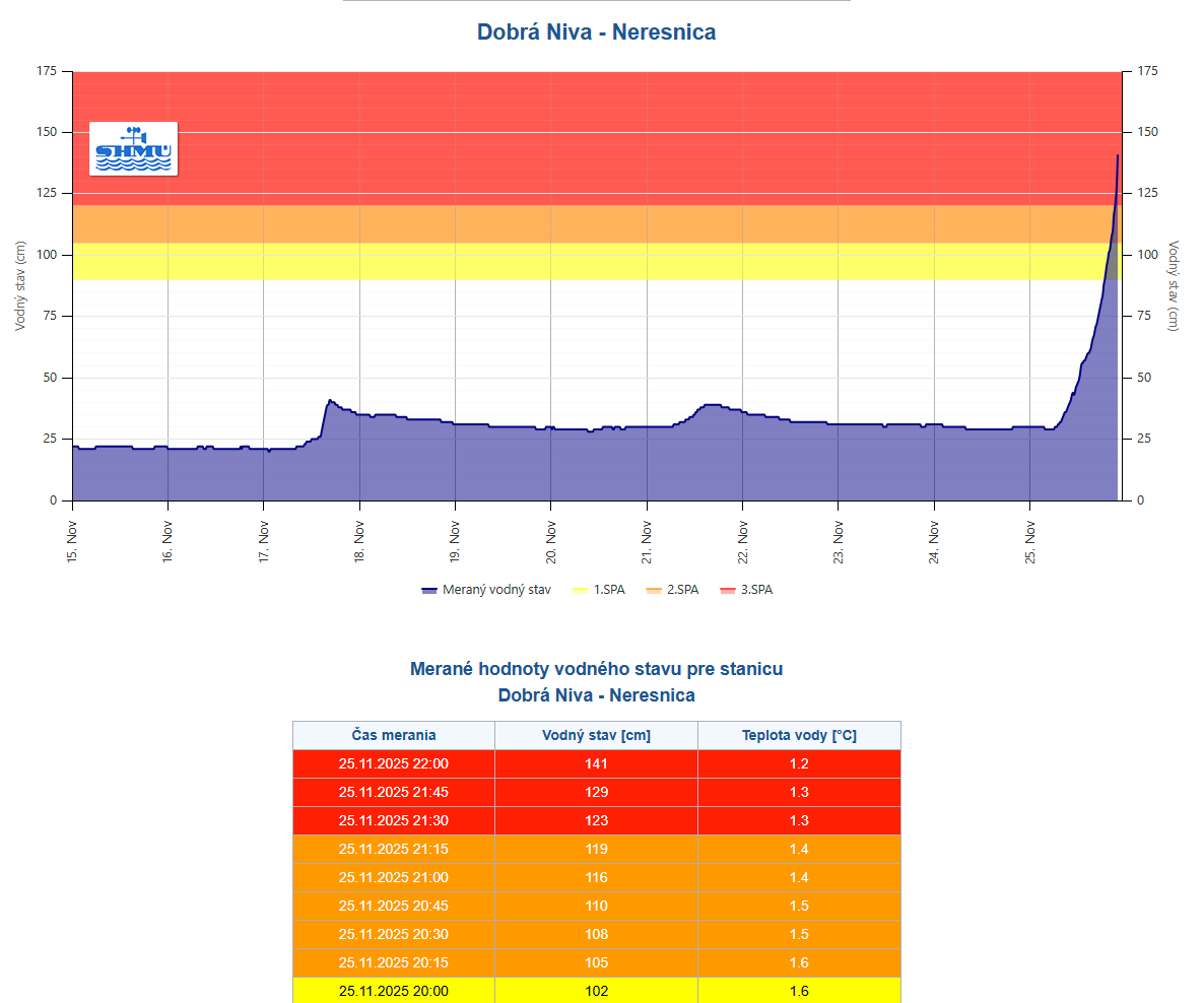 O 21:30 sme na prvom vodnom toku na Slovensku zaznamenali prekročenie najvyššieho stupňa povodňovej aktivity. Udialo sa tak v Dobrej Nive na rieke Neresnica, kde hladina presiahla 120 cm a prudko stúpa. Aktuálne dosahuje výšku už 141 cm, pričom bežná hladina je na úrovni 30 cm.