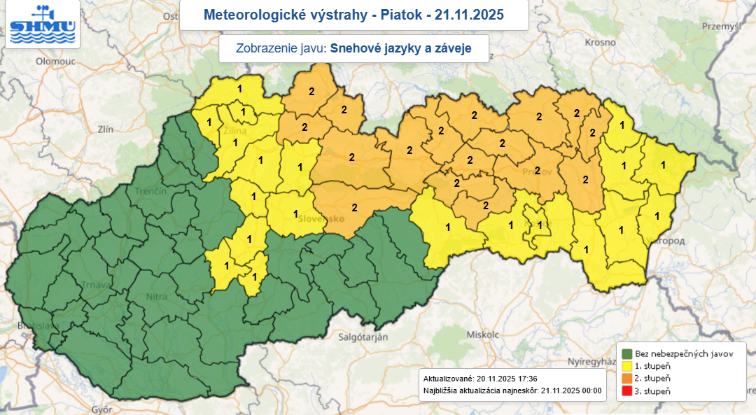 Kombinácia vetra a snehu bude viesť k snehovej kalamite a problémy na cestách možno očakávať hneď od ranných hodín. SHMÚ vydáva varovanie 2. stupňa pred tvorbou snehových jazykov a závejov, a to na celom severnom a severovýchodnom Slovensku.