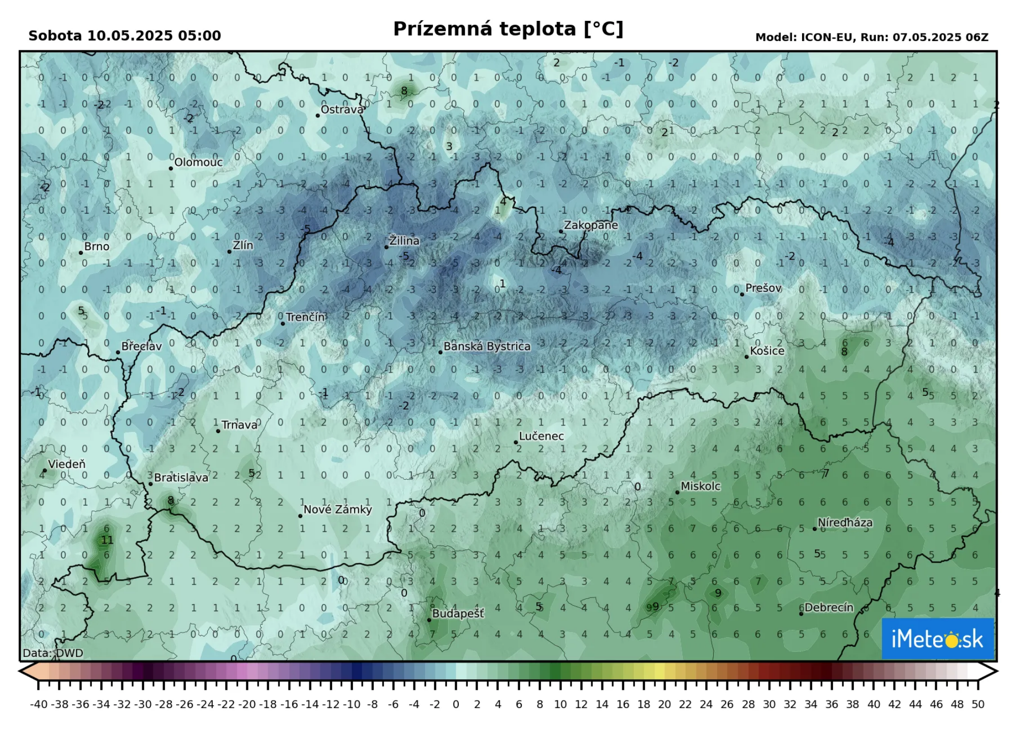V nedeľu sa bude situácia pomaly zmierňovať. Ráno sa síce ešte môžu vyskytovať mrazy, najmä v oblastiach s pretrvávajúcou nízkou oblačnosťou, no ich intenzita už nebude taká výrazná. Napriek tomu sa stále očakávajú ranné teploty v rozsahu od -1 do +3 °C, a teda riziko poškodenia vegetácie pretrváva. Denné teploty budú aj naďalej podpriemerné – len medzi +10 až +15 °C, na juhu o niečo viac.