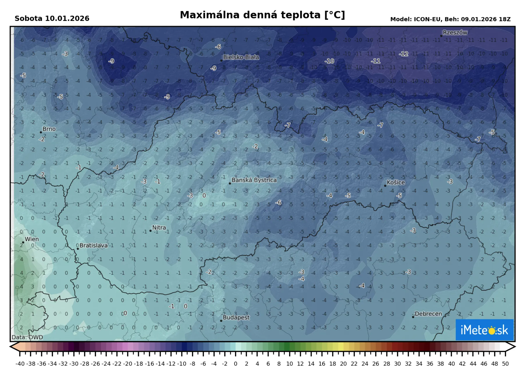 Počas soboty sa opäť na celom našom území očakávajú celodenné mrazy. Najchladnejšie bude na východe, kde sa maximálna teplota vyšplhá len na -7 až -3 °C. Najteplejšie bude v západnej časti územia, kde bude snežiť a teploty by sa mohli dostať aj k nule.