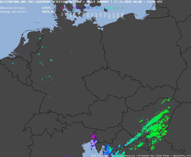 Čelo studeného frontu aktuálne postupuje cez východné Maďarsko a východné Slovensko a na tomto čele dochádza ku tvorbe búrok. Detektory bleskov zaznamenali už viac ako 15 000 bleskov.