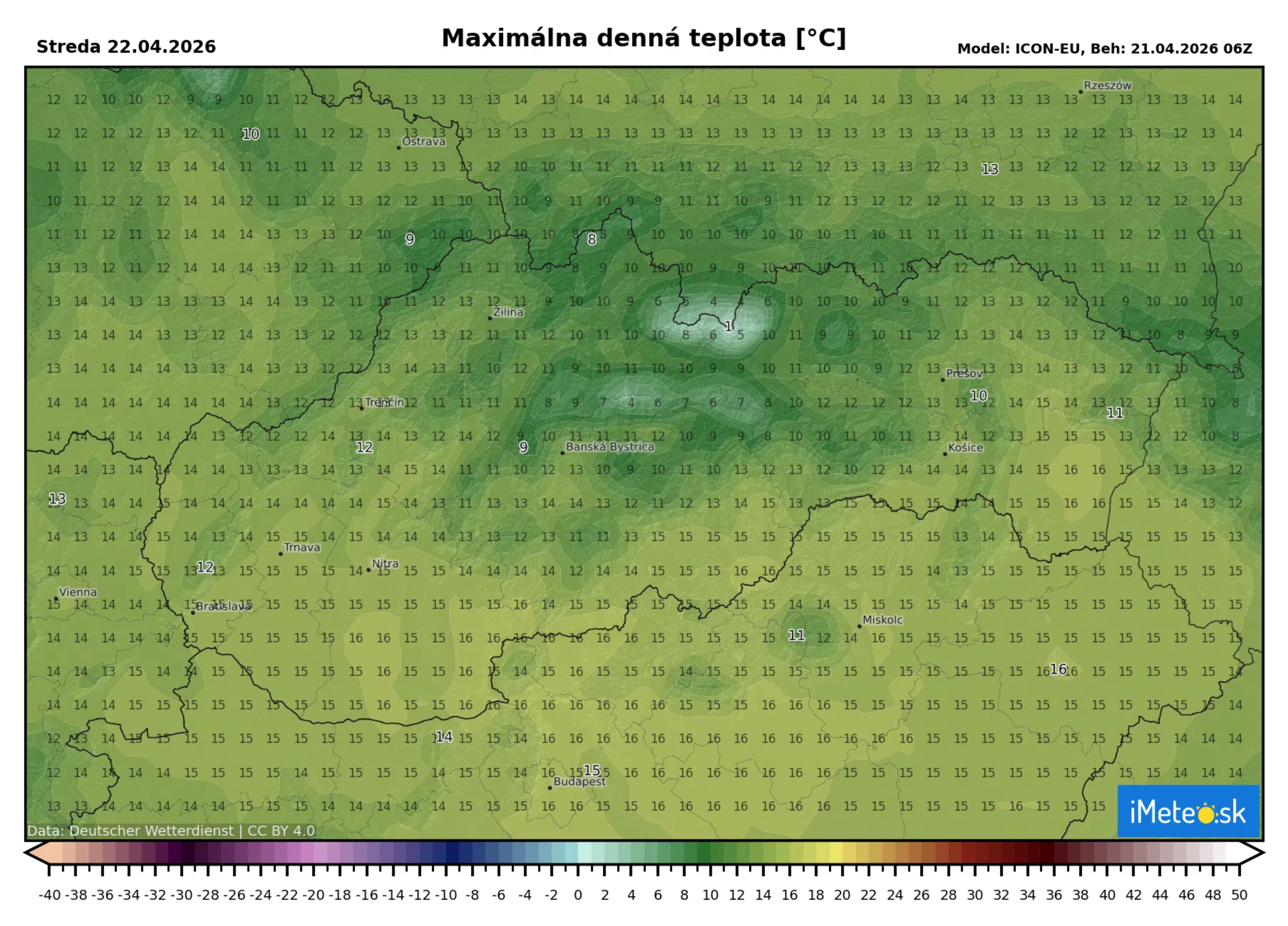 Maximálne denné teploty sa vyšplhajú na +12 až +17 °C. Citeľne chladnejšie však zostane na severe Slovenska – na Kysuciach, Orave, v Liptove a na hornom Spiši sa teplota bude pohybovať len okolo +10 °C.