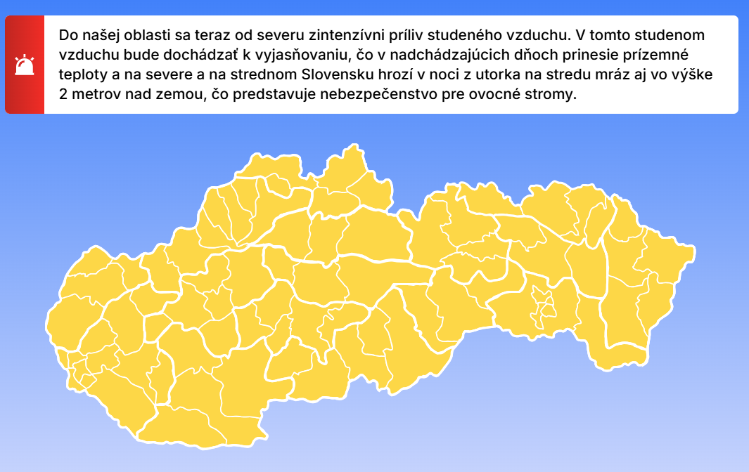 Slovensko čaká poriadne mrazivé ráno. Kvôli prílivu studeného vzduchu hrozí mráz, ktorý môže vážne poškodiť ovocné stromy. Deň však prinesie slnko a teploty do +17 °C.