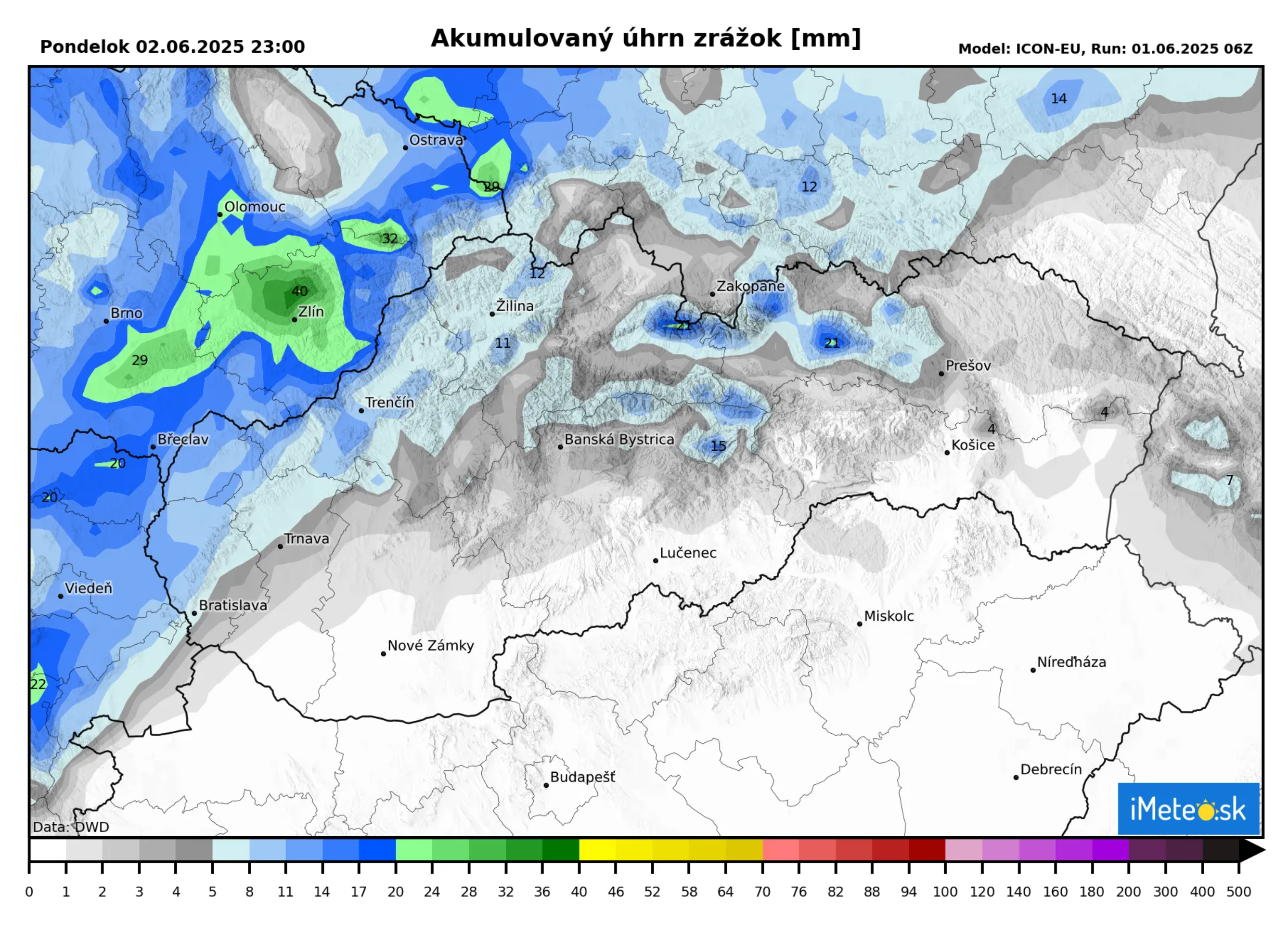 Pondelok bude dusný a na viacerých miestach, najmä popoludní a večer, očakávame prehánky aj búrky s úhrnmi zrážok od 10 mm do 40 mm.