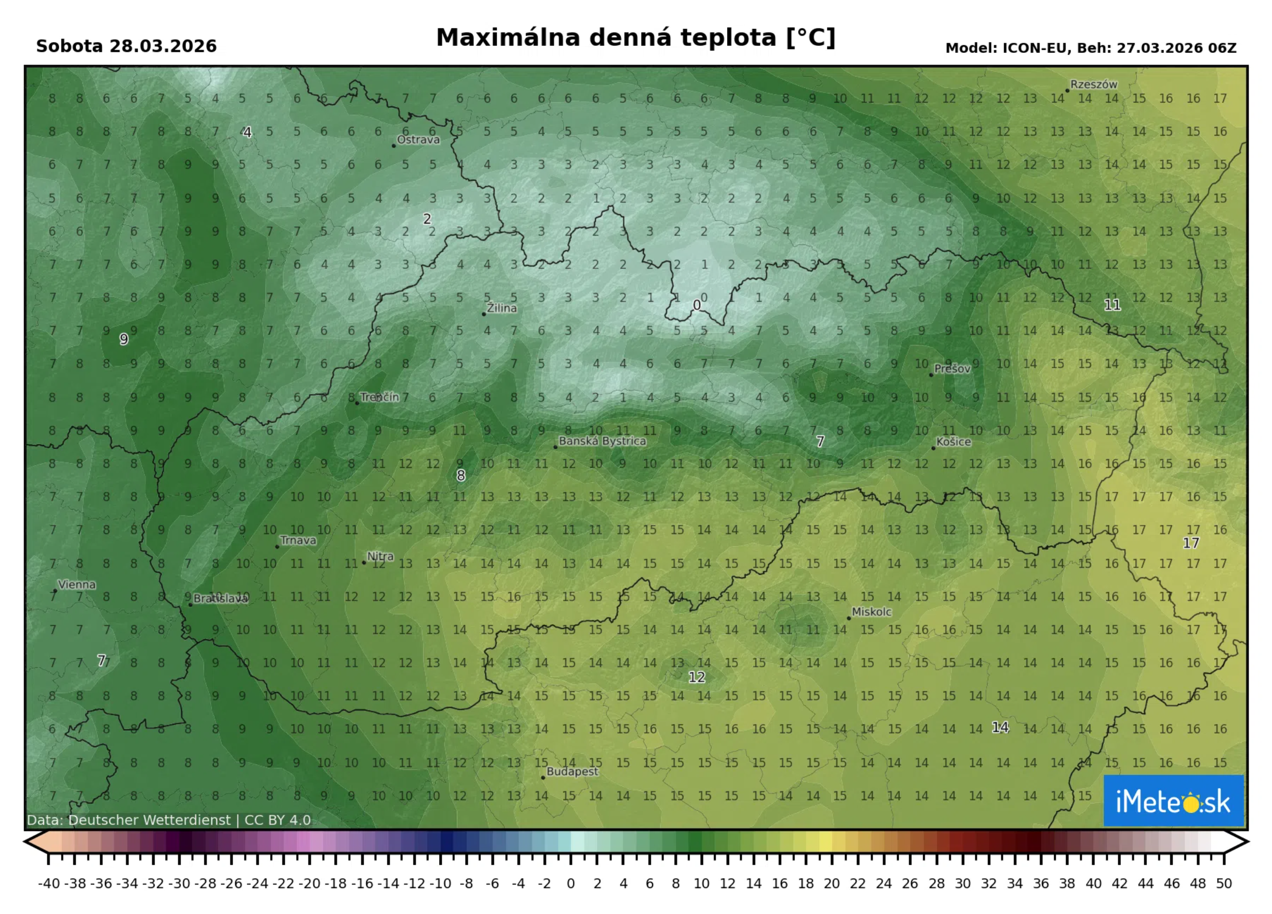 Zatiaľ čo maximálne teploty v severnej polovici nášho územia a na severozápade sa budú pohybovať len od +3 do +8 °C, teplý vzduch z juhovýchodu vyženie teploty k +11 °C až +18 °.