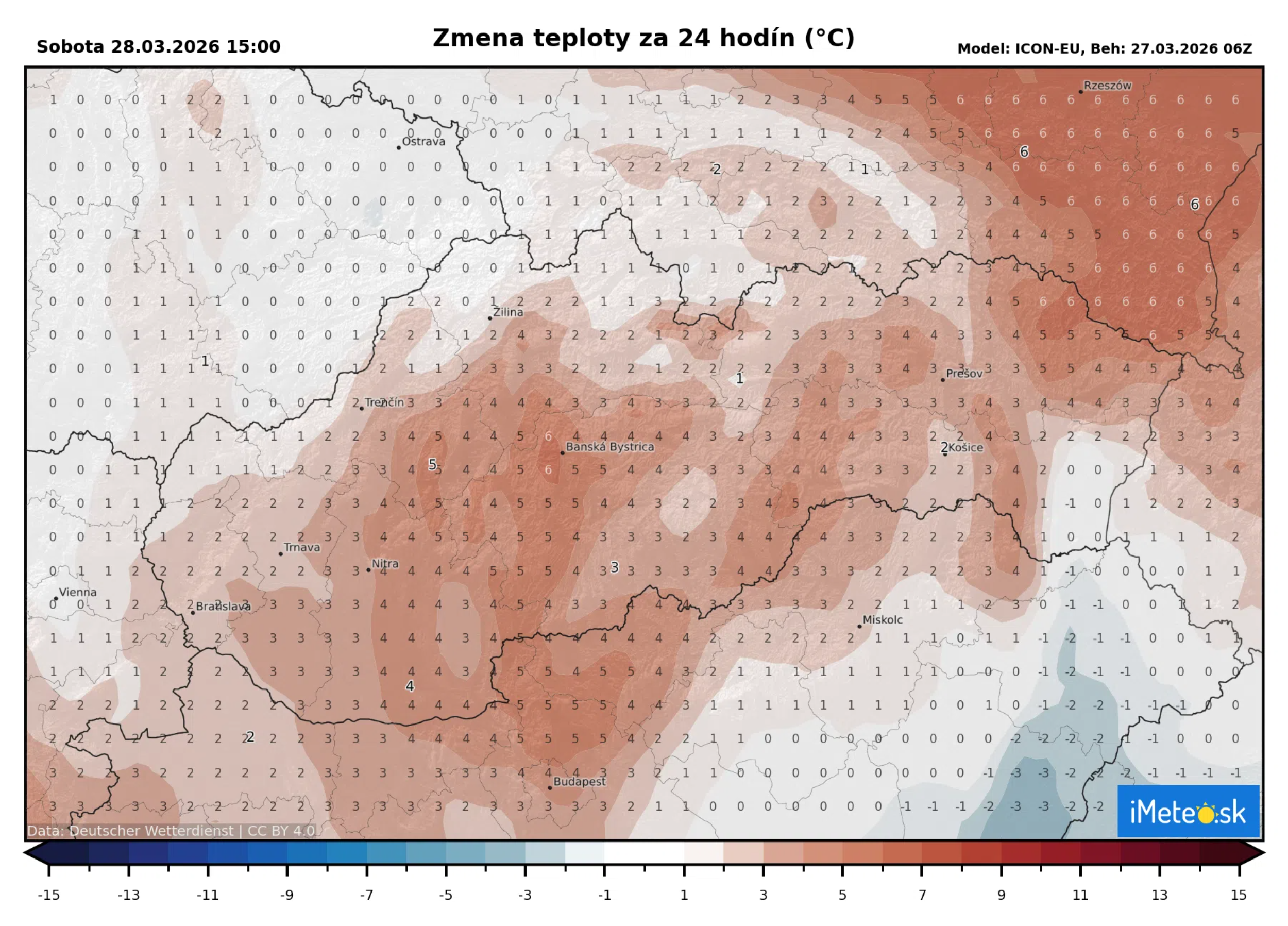 V porovnaní s piatkom tak bude rozdiel maximálnych teplôt lokálne aj o 6 °C.Teplota na horách vo výške 1 500 m n. m. bude okolo +1 °C.