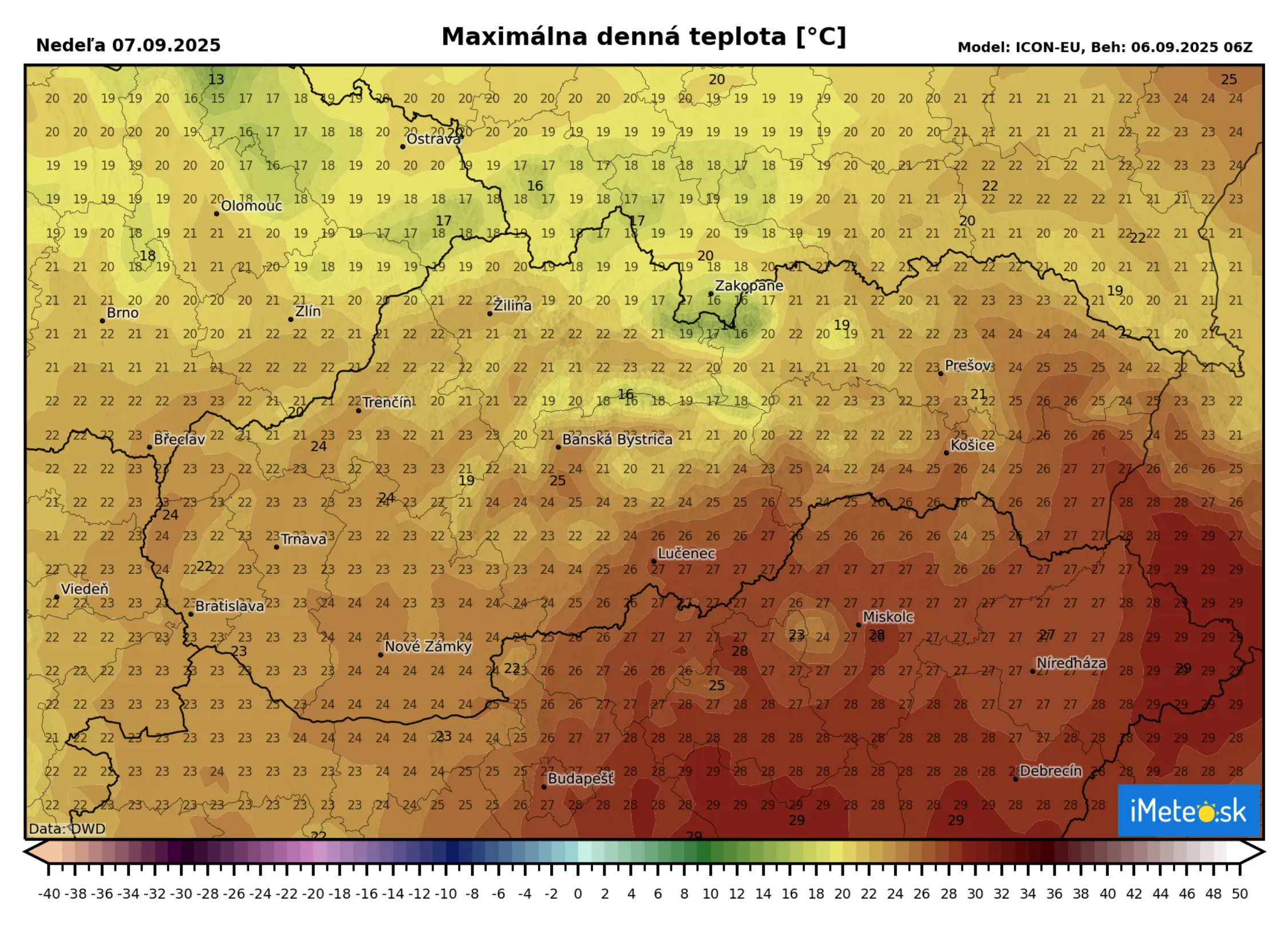 Maximálne denné teploty budú v západnej polovici Slovenska o niečo vyššie ako dnes a to od +20 °C do +24 °C, teplejšie bude na východe, kde môže byť až +27 °C, lokálne v pohraničných oblastiach Košického kraja aj o niečo vyššie.