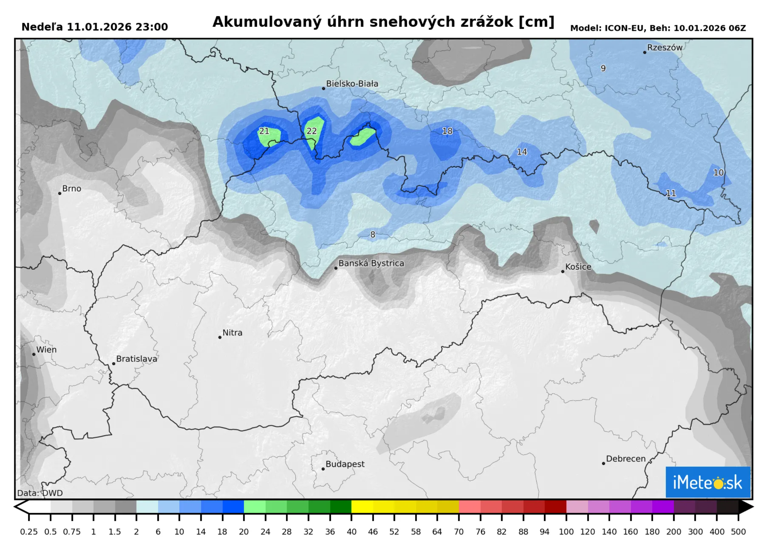 Sever Slovenska obdrží pomerne slušnú snehovú nádielku počas zajtrajšieho dňa, a to až 20 cm nového snehu, miestami aj viac. Stredné a južné oblasti Slovenska sa snehu zajtra nedočkajú.