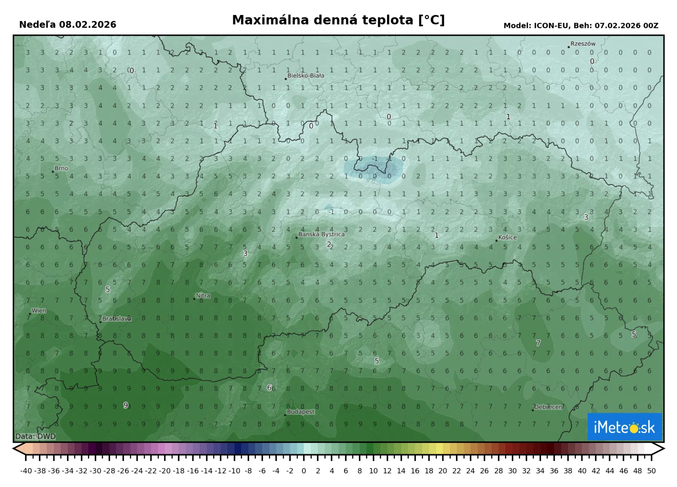 Maximálne denné teploty sa budú pohybovať od 0 až +1 °C na severe stredného a východného Slovenska až po +8 až +9 °C na juhozápade Slovenska. Znova platí, že východná polovica Slovenska bude chladnejšia ako tá západná.