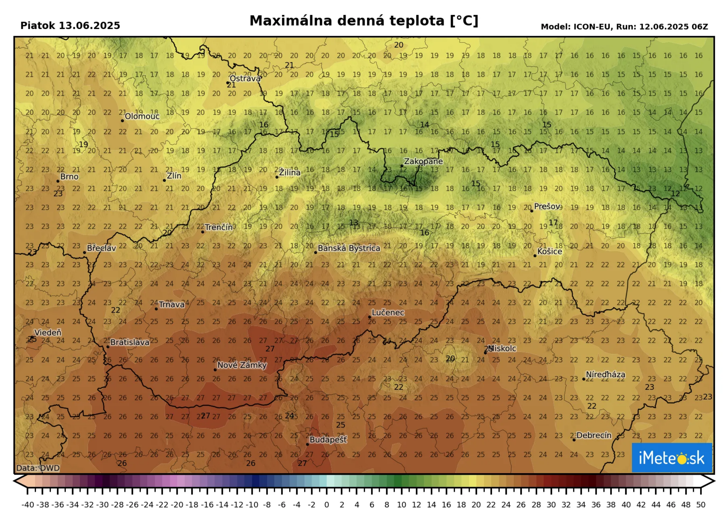 Najvyššia denná teplota sa bude pohybovať od +23 až +29 °C, na severe a východe chladnejšie, a to od +17 až +23 °C. Napríklad v Bratislave sa teplota bude pohybovať od +13 do +29 °C, v Košiciach do +23 °C na Orave do +19 °C.