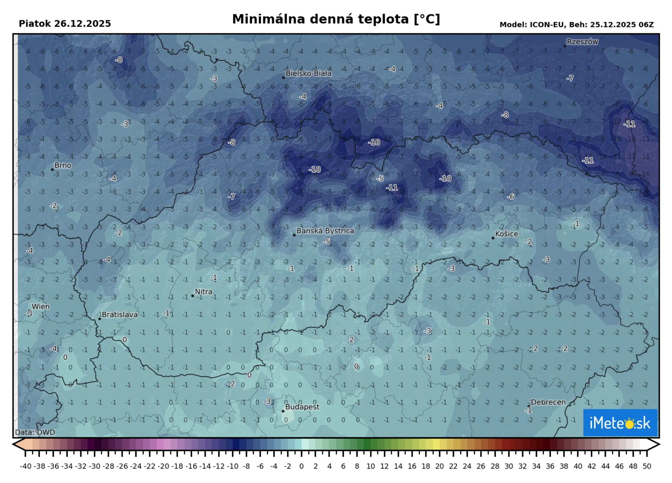 Nočné teploty ale poriadne poklesnú a na severe stredného Slovenska v dolinách môžu poklesnúť až na -11 °C. Silnejší mráz bude aj na severovýchode, kde očakávame okolo -5 až -6 °C.