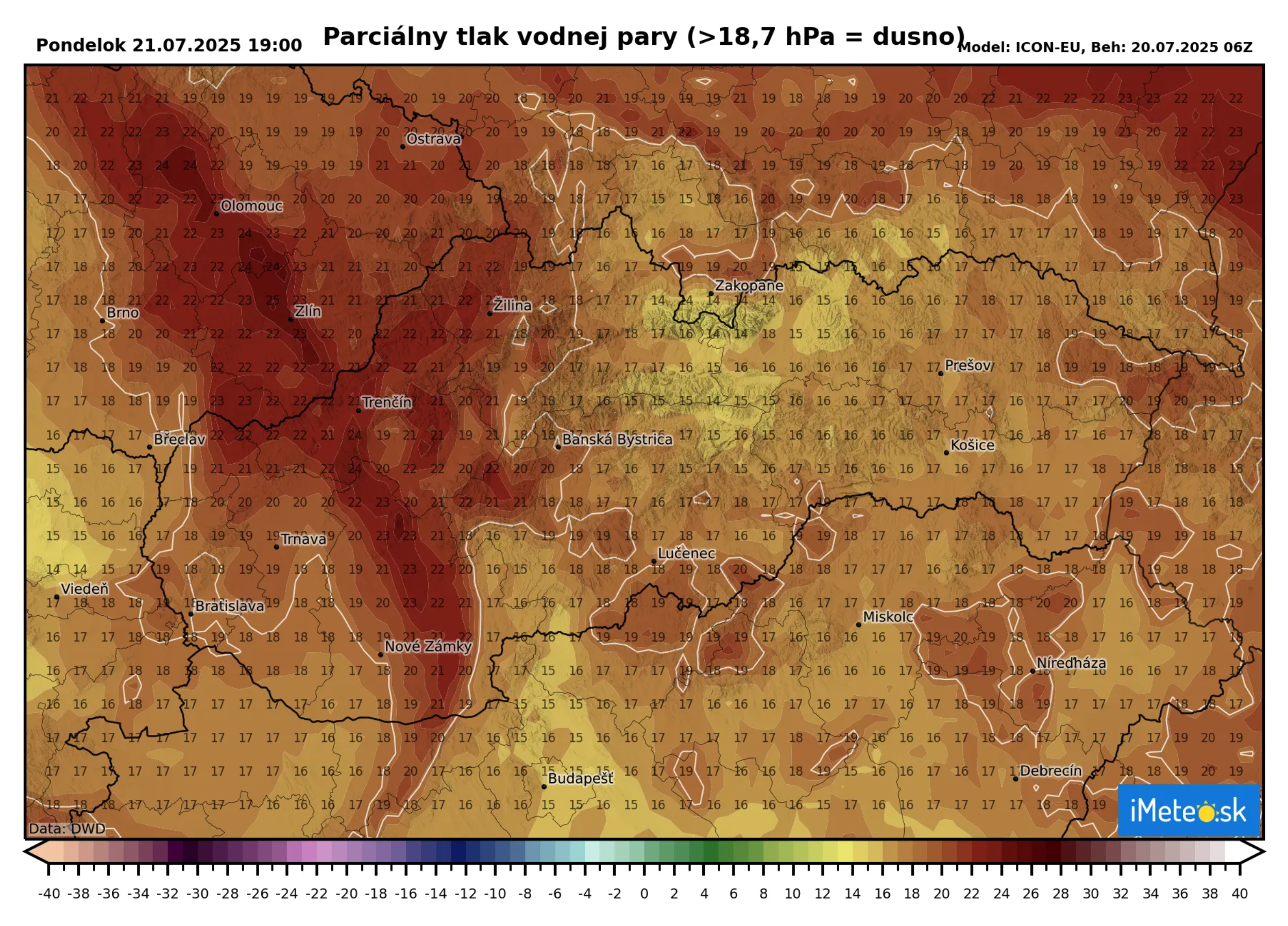Najvýraznejšie dusno budeme pociťovať popoludní od 16.00 h na celom západnom Slovensku, pričom parciálny tlak vodnej pary vystúpi až na hodnotu 24 hPa, čo je výrazná hodnota.