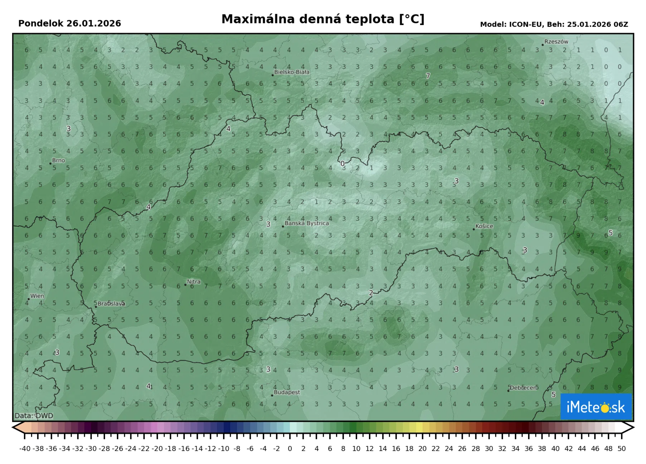 Rozpätie maximálnych teplôt bude veľké, ale všetky teploty sa počas dňa budú držať nad nulou. Zajtra teda bude v najchladnejších oblastiach stredného Slovenska okolo +2 °C, v najteplejších až dokonca +8 °C.