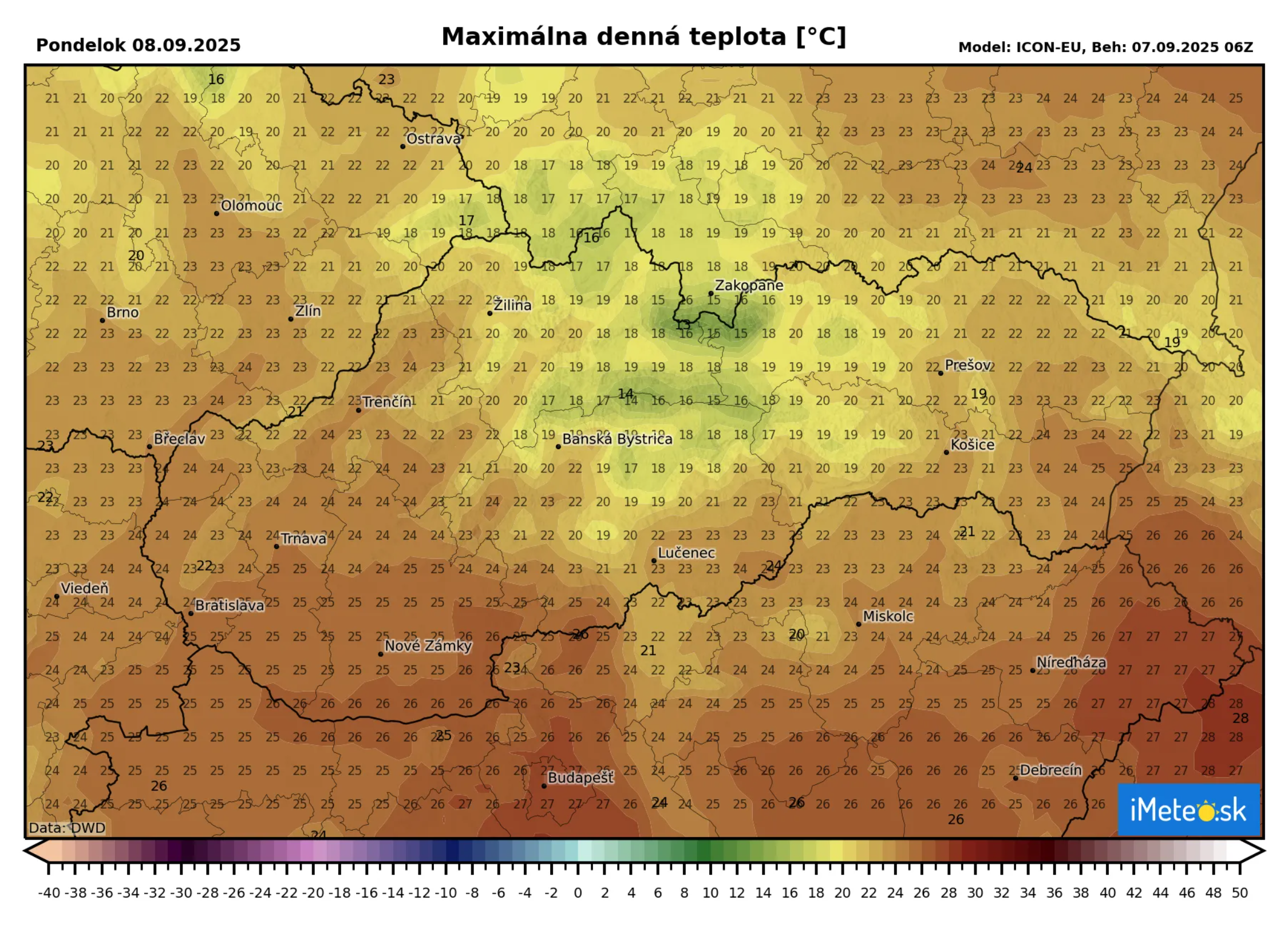 Maximálna denná teplota vystúpi na +20 °C až +26 °C, na Orave a pod Tatrami bude o niečo chladnejšie a to okolo +16 °C až +19 °C.