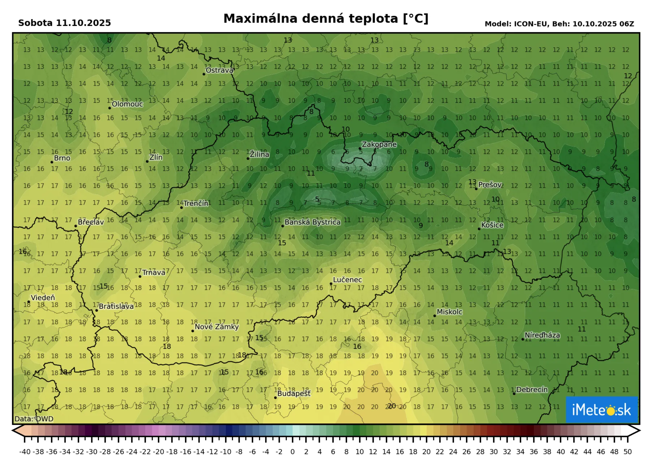 Maximálne denné teploty na rozdiel od tých dnešných mierne porastú, a to hlavne na juhozápade a juhu stredného Slovenska, kde bude až +18 °C. Na ostatnom území očakávajte teploty od +9 °C na severe až po +15 °C.