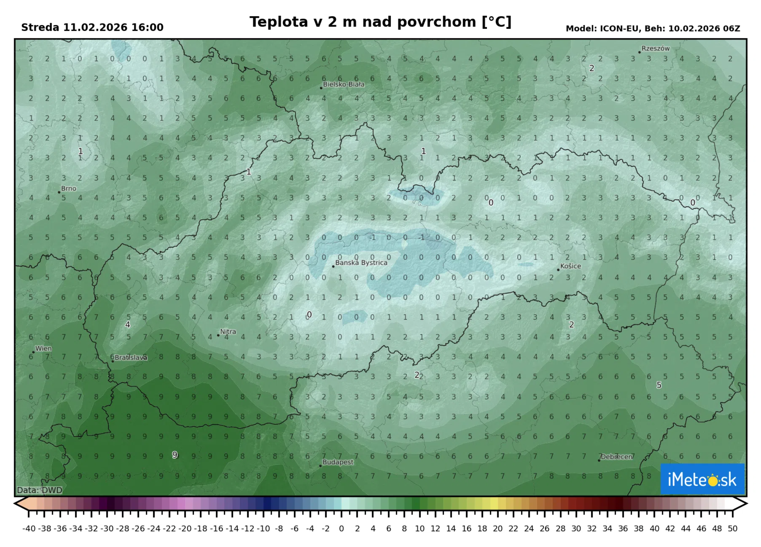 Kým ranné minimá sa ešte môžu na severe a východe krajiny pohybovať v blízkosti nuly, denné maximá sa v najteplejších oblastiach Podunajskej nížiny vyšplhajú až na úroveň +10 °C, pričom aj v horských dolinách očakávame odmäk.