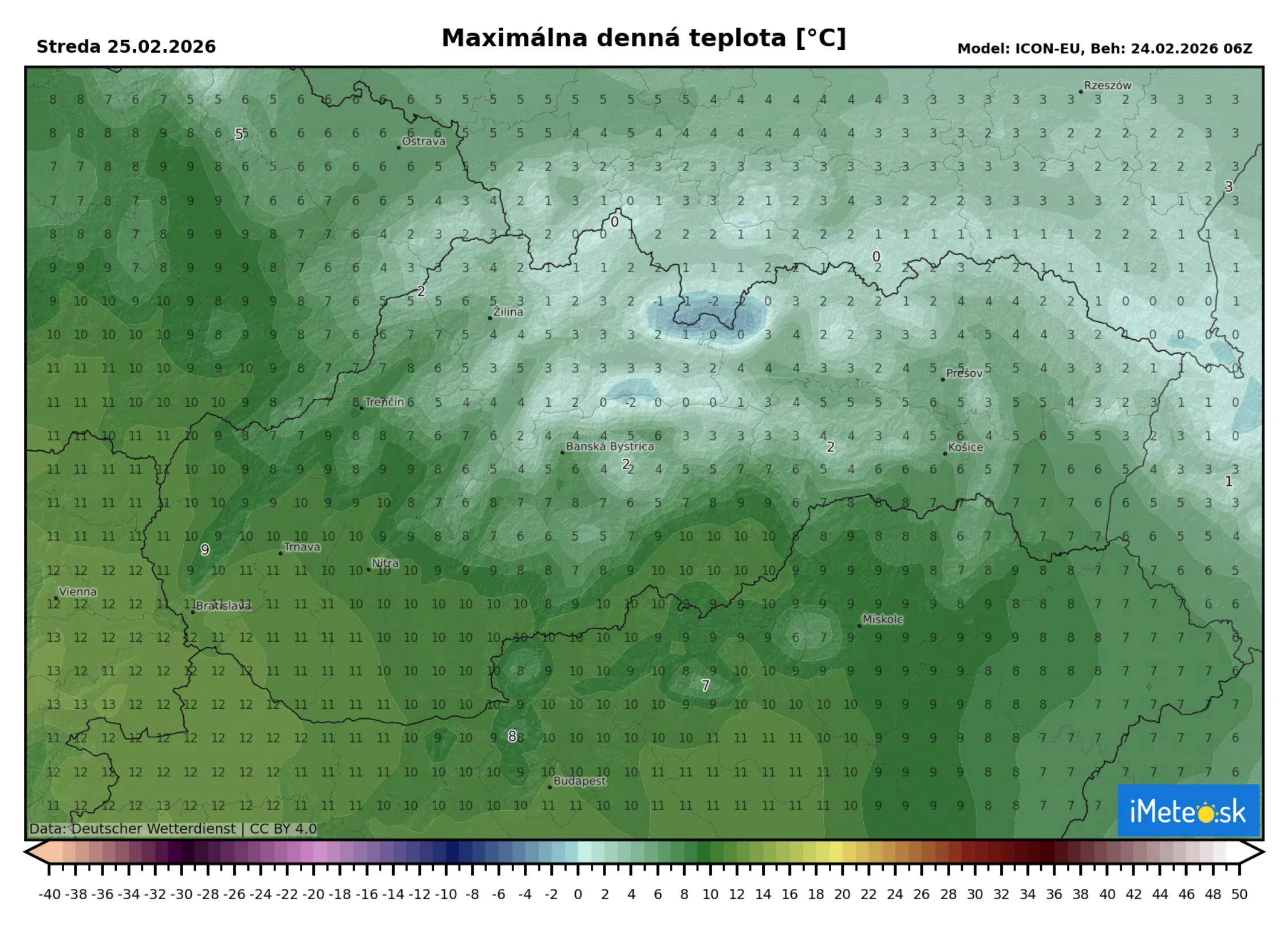 Maximálne denné teploty budú podobné ako dnes a to od +1 až po +5 °C v severných okresoch, južnejšie až do +11 °C. Na krajnom juhozápade môže teplota vystúpiť aj na +12 °C.