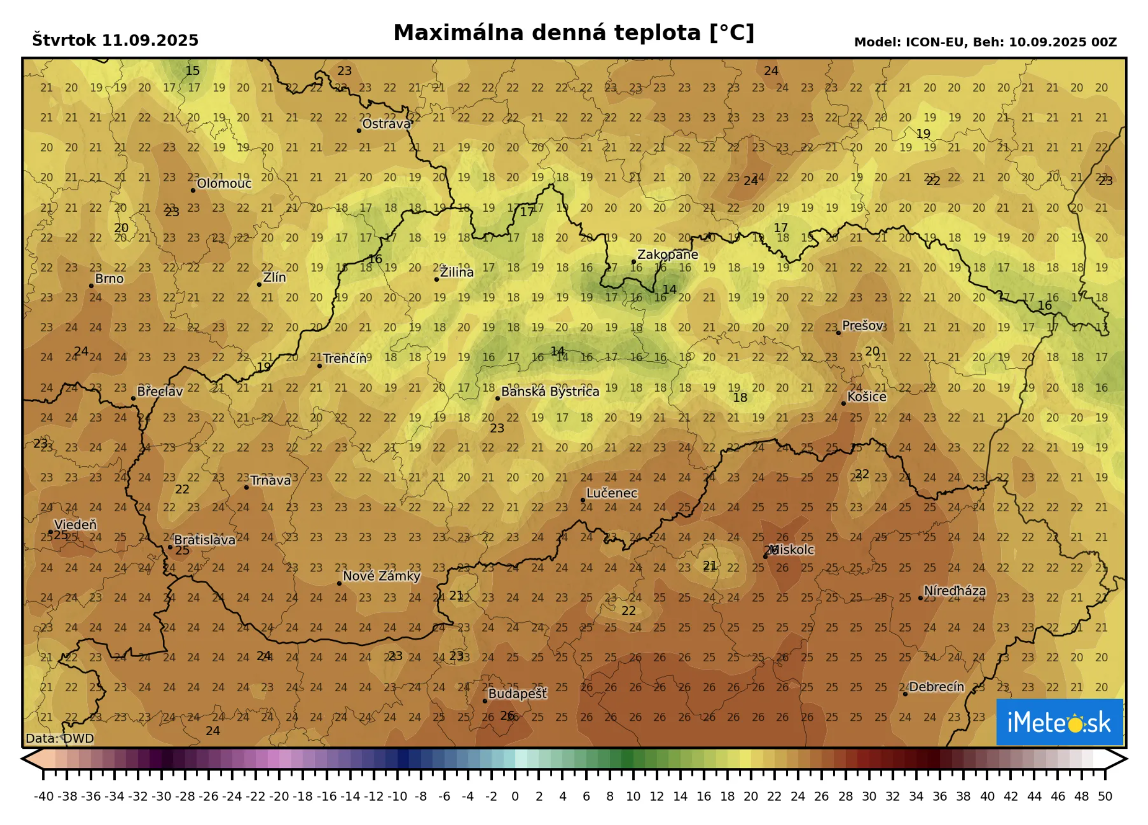 Na severe Slovenska zajtra očakávame teploty len okolo +17 °C, na ostatnom území budú maximá dosahovať od +20 °C do +23 °C. Lokálne môžeme ešte dosiahnuť hranicu letného dňa.