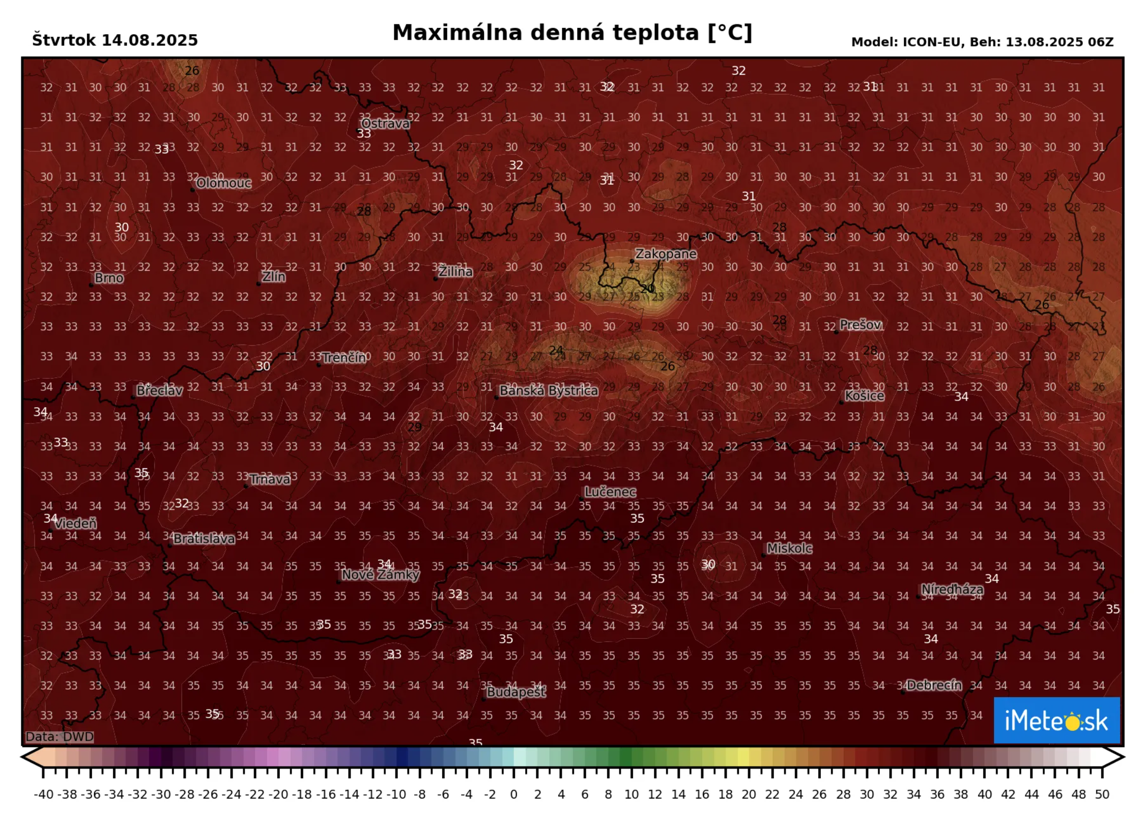 Denné maximá sa vyšplhajú od +30 °C na Orave až po +35 °C na juhu a juhozápade Slovenska a lokálne môžu túto hranicu supertropického dňa aj presiahnuť.