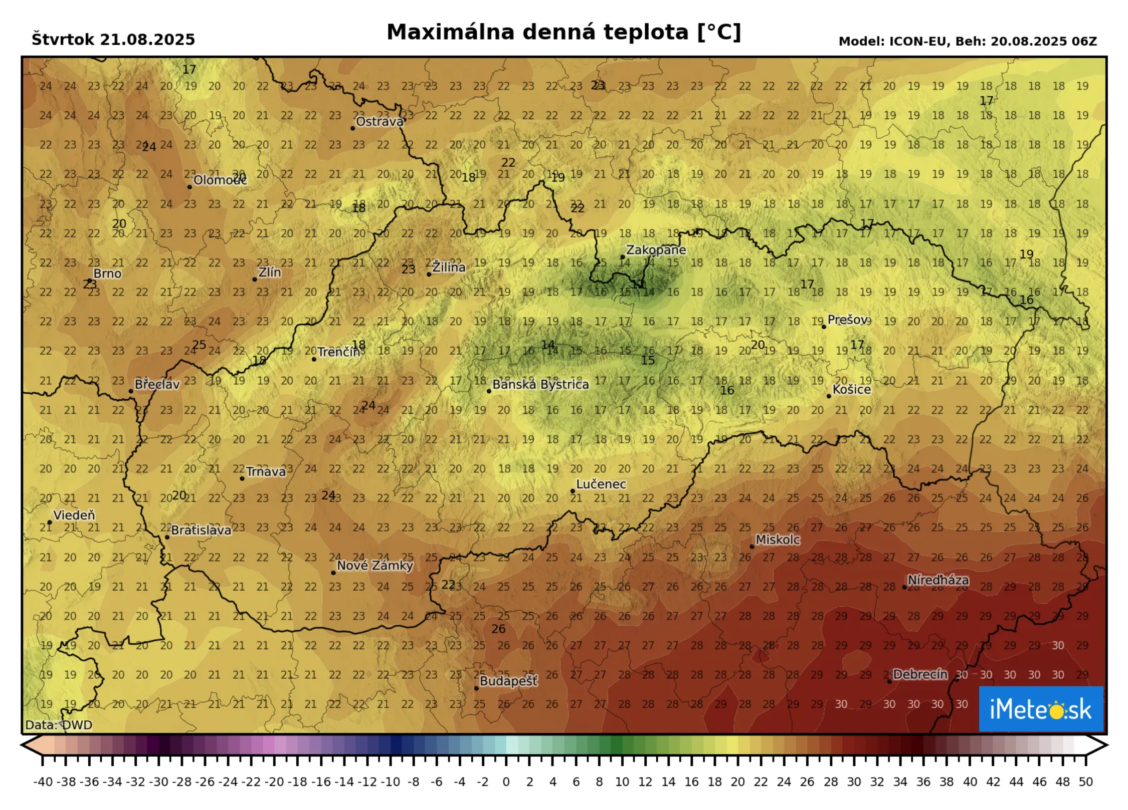 Denné teploty budú nižšie aj o 10 stupňov a teda očakávajte ich v rozmedzí od +17 °C na severovýchode po +25 °C na juhozápade Slovenska. Najväčší prepad teplôt za 24 hodín bude na juhozápade a na východe v okolí Prešova.