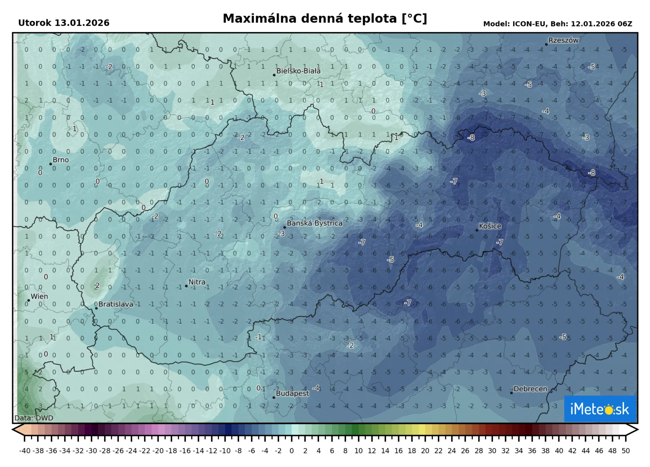 Maximálne denné teploty budú veľmi rozdielna na západnom a strednom Slovensku oproti východu. V západnej polovici už bude pôsobiť teplý vzduch, takže tam budú teploty od -2 do +2 °C, na východe ešte bude chladno a to od -4 do -6 °C.