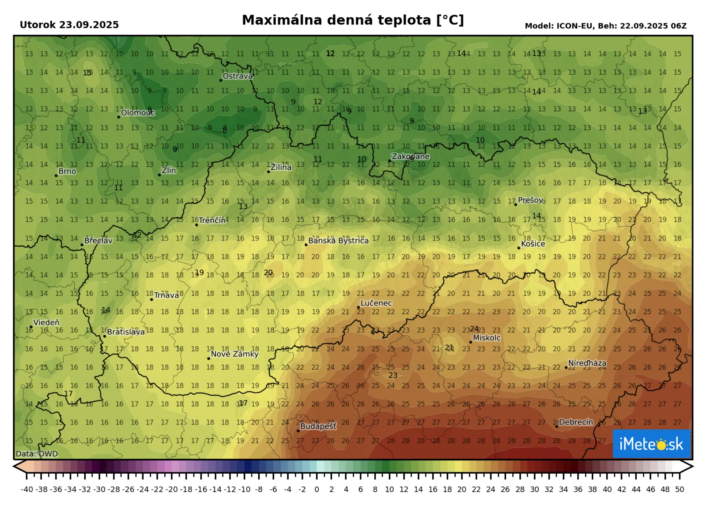 Maximálne denné teploty sa budú pohybovať od +11 až +13 °C v severných okresoch stredného a východného Slovenska až po +18 °C na juhozápade a najteplejšie bude na juhu stredného a východného Slovenska, kde už bude príjemných +20 až +22 °C.