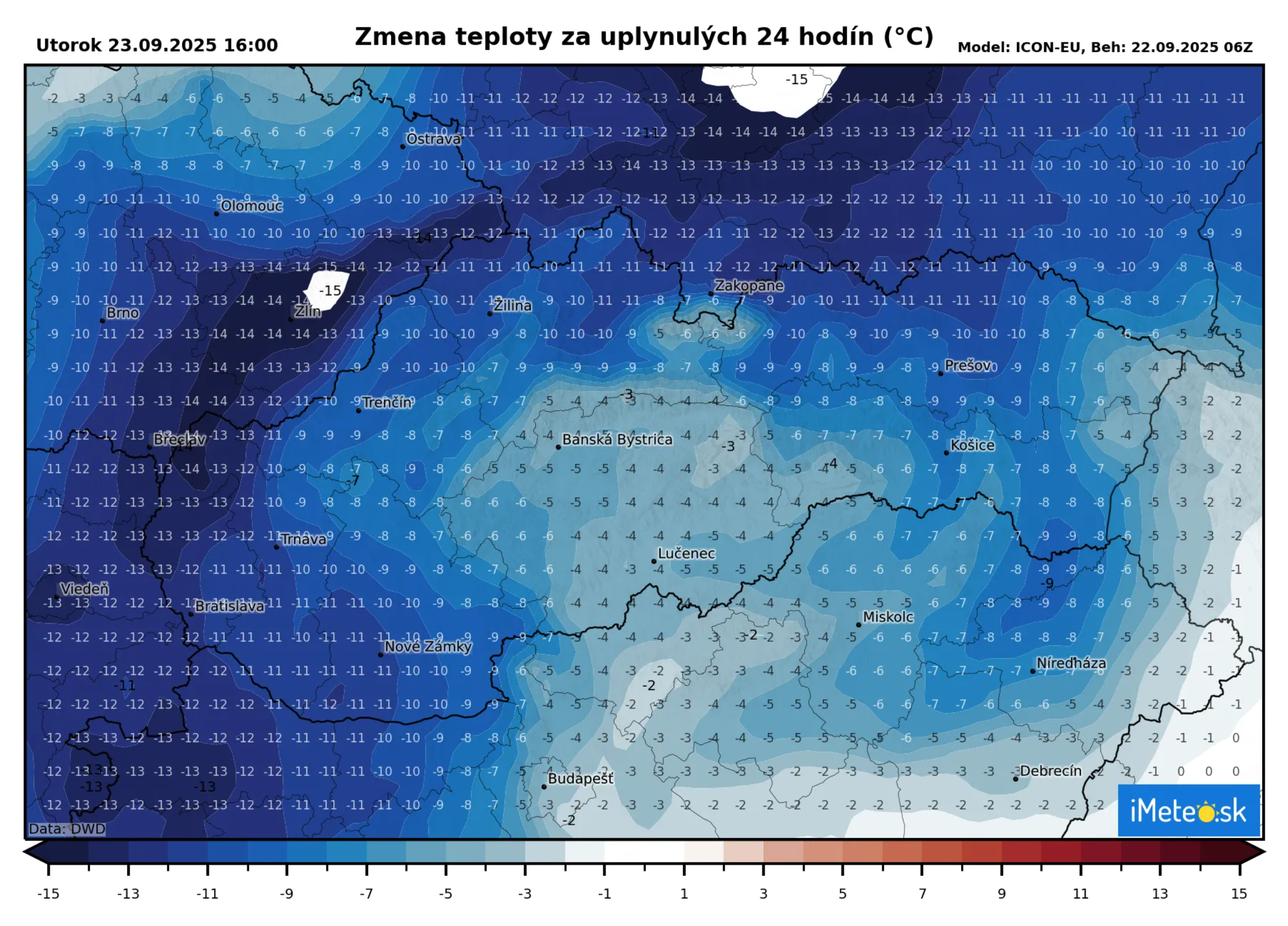 Najvýraznejší prepad teplôt bude na západe, konkrétne na Záhorí, kde bude rozdiel oproti dnešným maximám aj 10 až 14 °C.