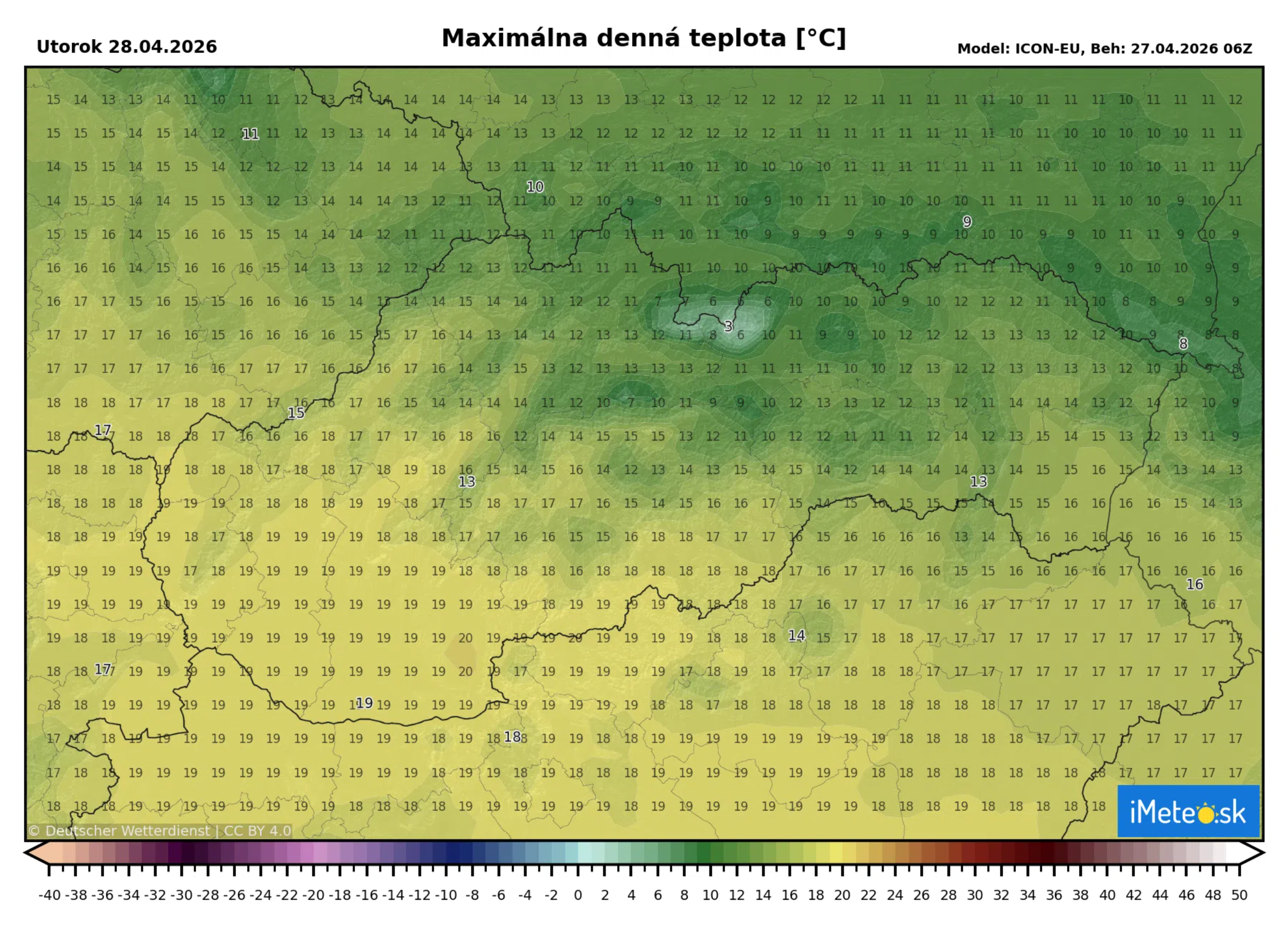 Najvyššia denná teplota v utorok vystúpi k +13 °C až +19 °C, v severnej polovici územia miestami k +12 °C až +16 °C.