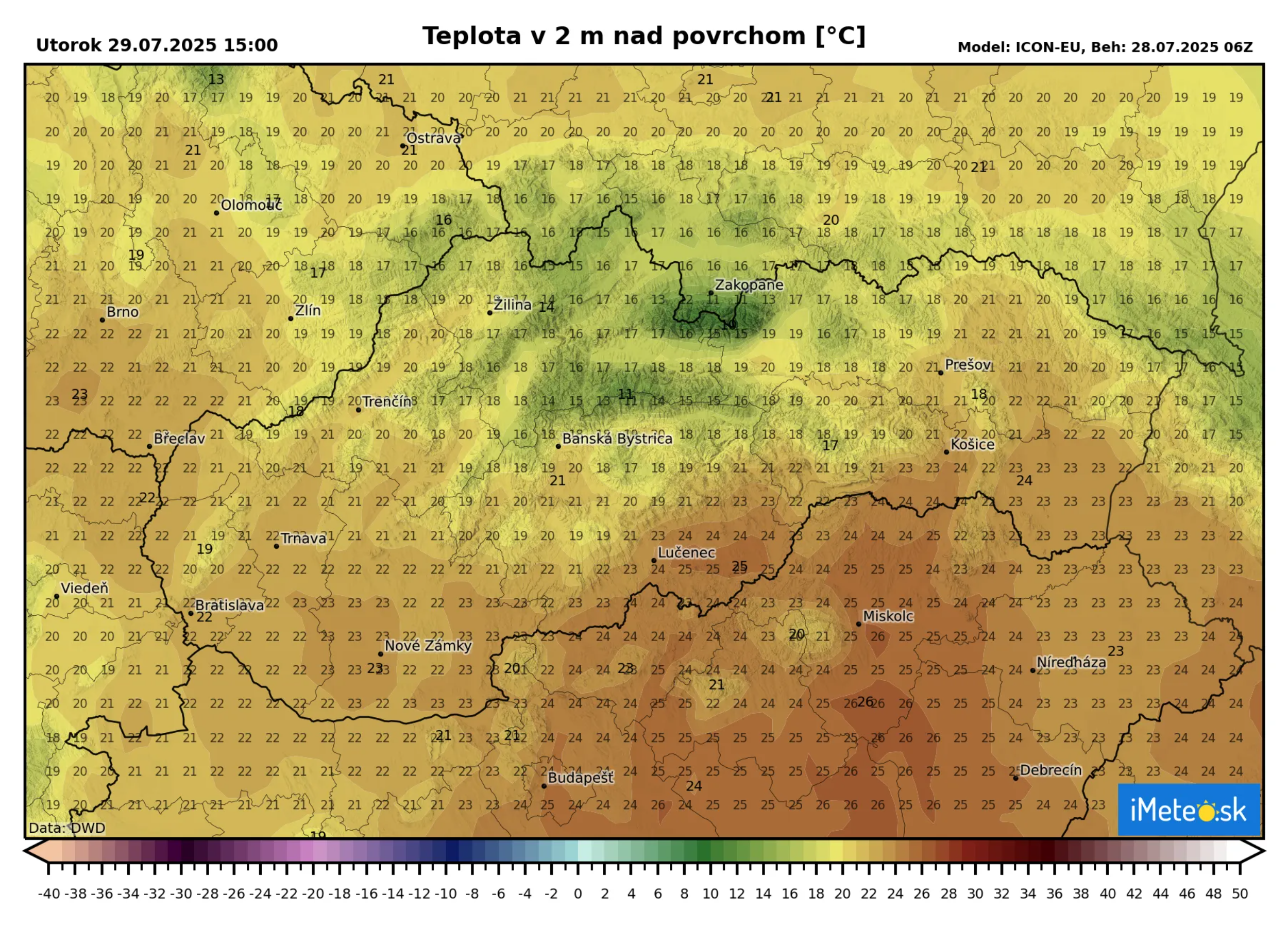 V Bratislave sa zajtra teploty vyšplhajú do +23 °C, o niečo teplejšie bude v Košiciach s teplotami do +25 °C. Na severe, napríklad v Žiline, bude chladnejšie s teplotami do +18 °C, pričom na horách bude v utorok len okolo +11 °C.