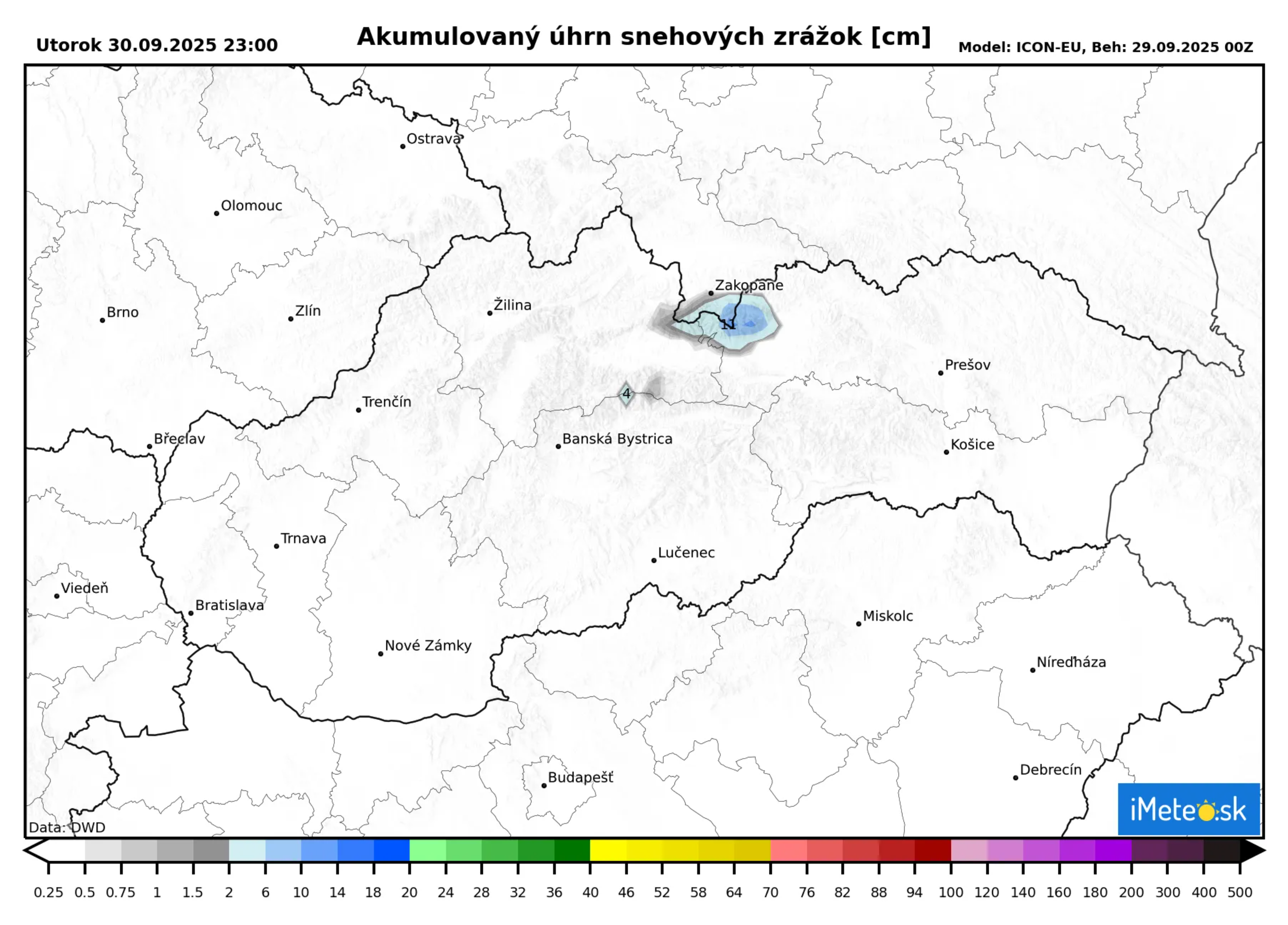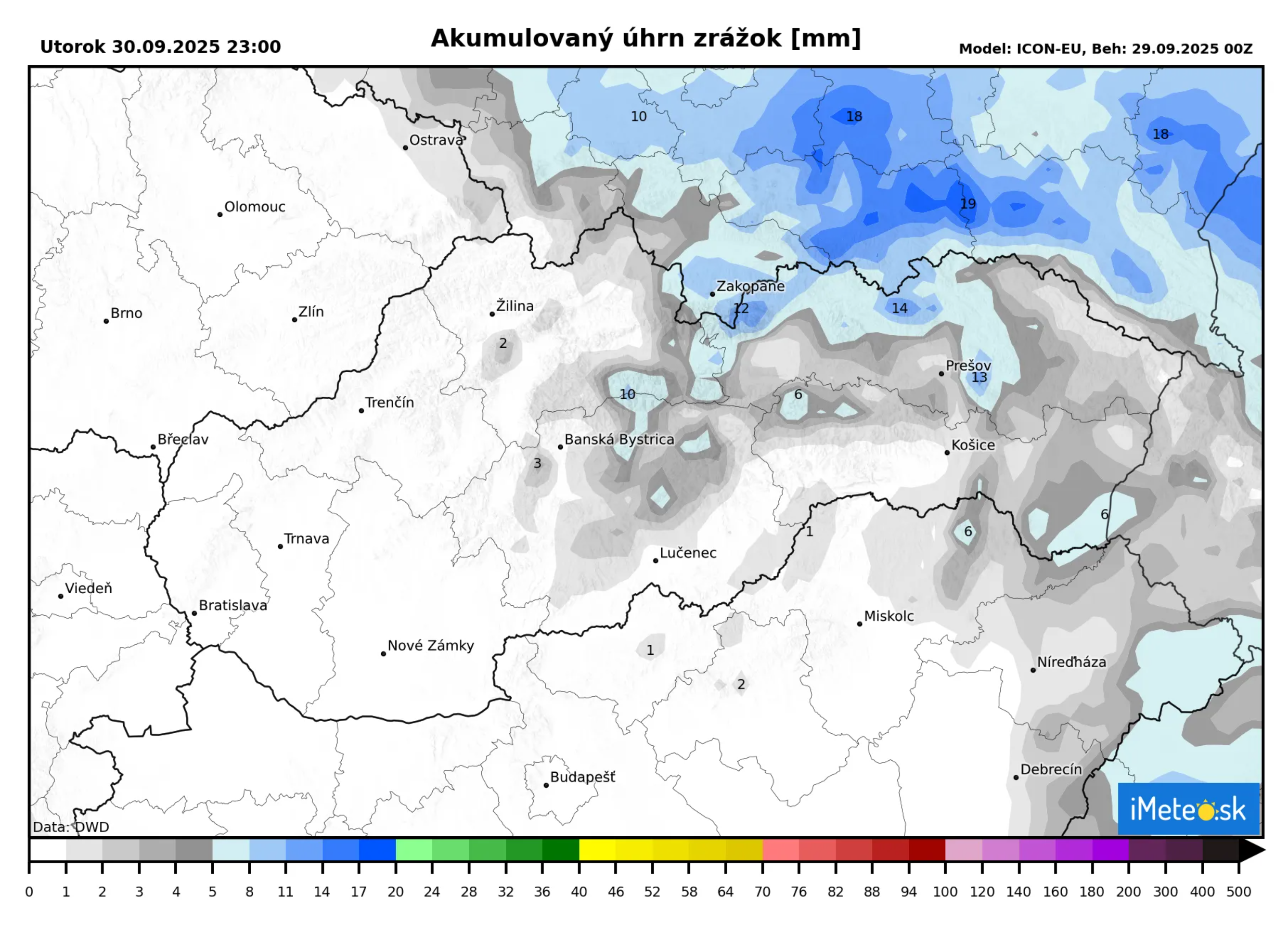 Teploty budú v utorok ešte nižšie než dnes – najvyššia denná teplota vystúpi k +11 až +16 °C. Na Kysuciach, Orave, Liptove, Spiši a krajnom severovýchode bude ešte chladnejšie, a to +5 až +10 °C, na horách vo výške 1 500 metrov nad morom len okolo +1 °C.