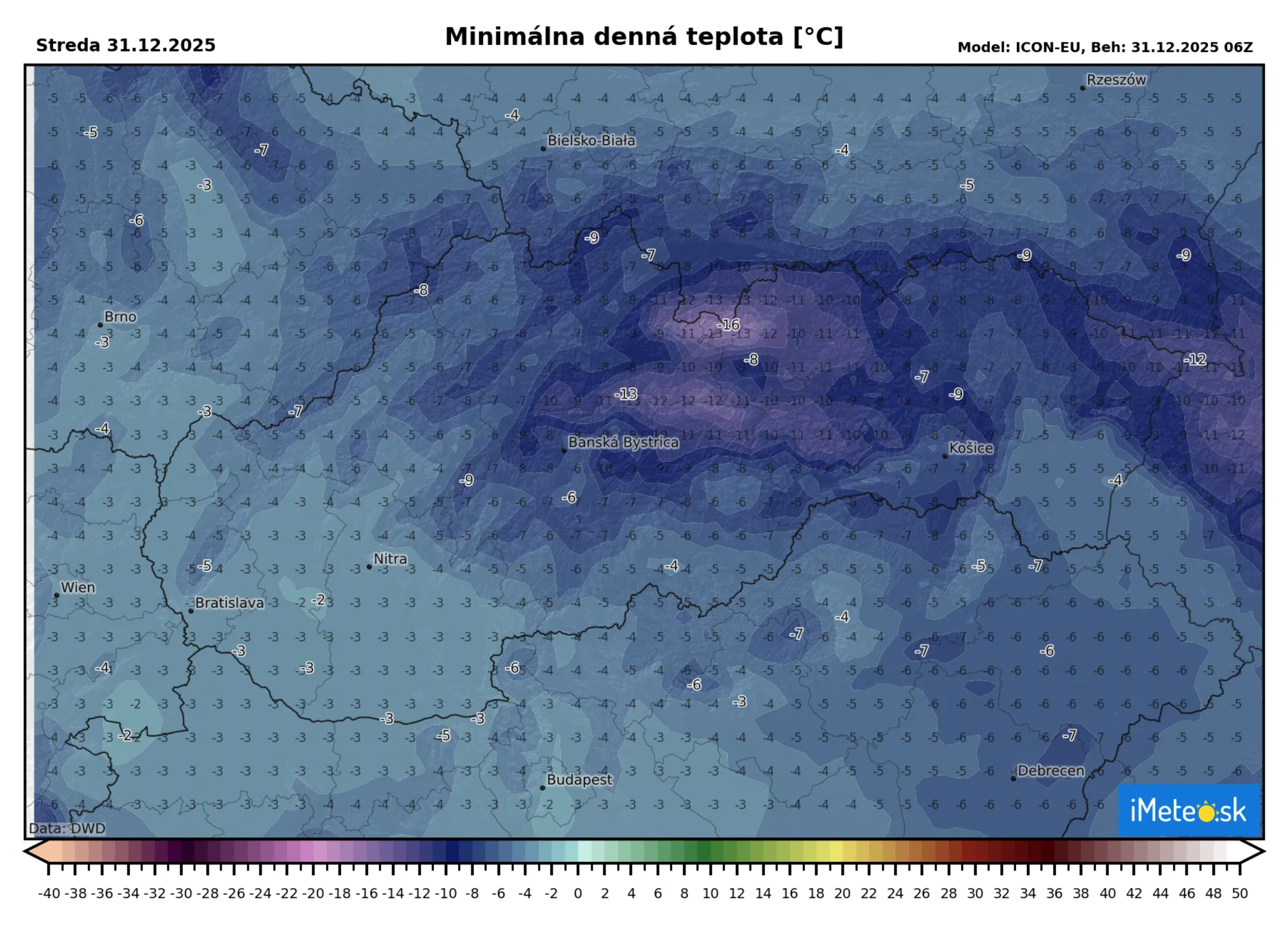 Okrem sneženia však prináša silvestrovský deň aj poriadny mráz, a to prakticky na celé naše územie. Najvyššie denné teploty na západe oscilujú okolo bodu mrazu, zatiaľ čo v obciach pod Tatrami klesajú k -10 °C a na stanici Lomnický štít sa denná teplota pohybuje medzi -22 až -23 °C.
