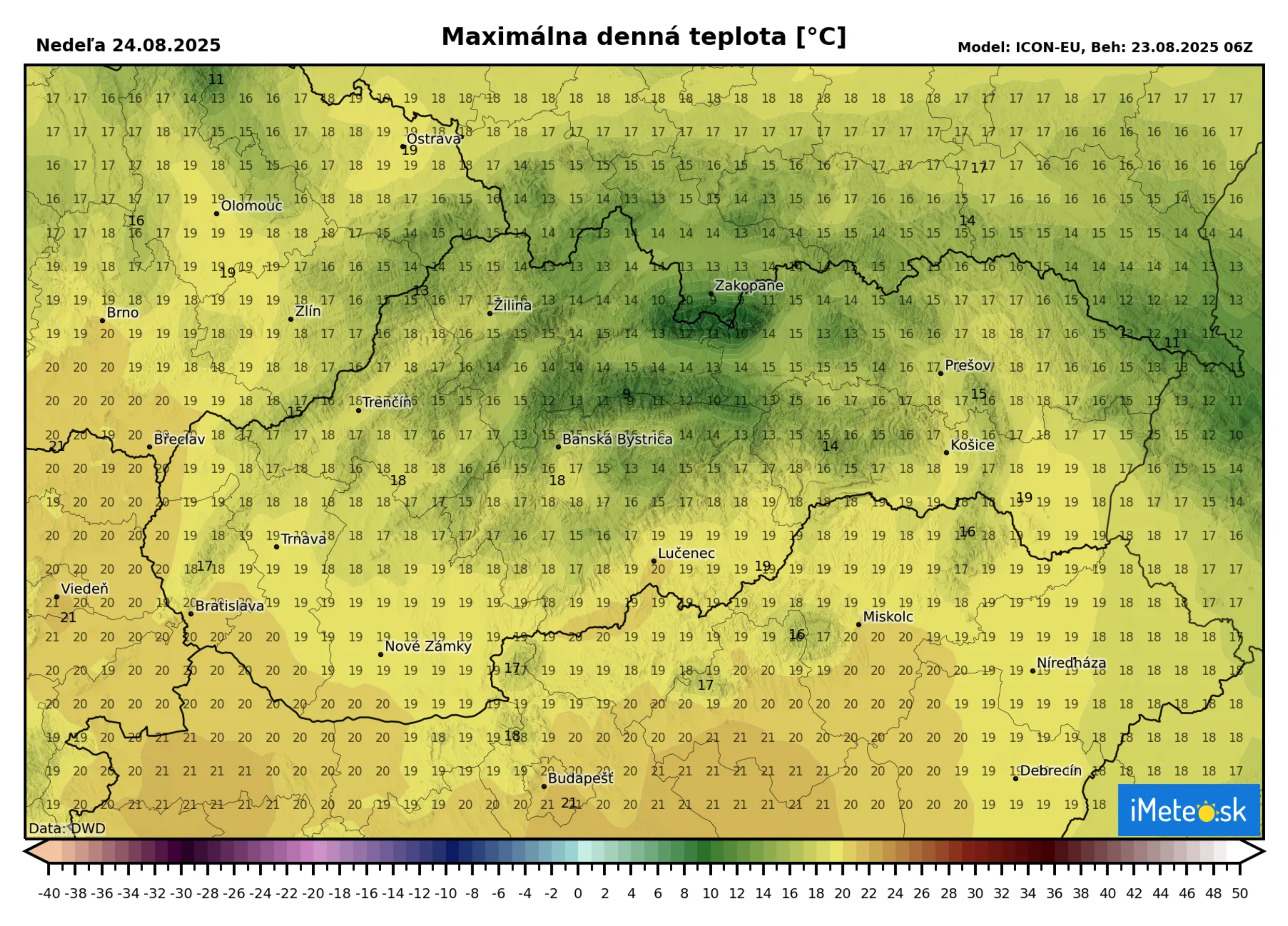 Nedeľa bude chladná, najvyššia denná teplota vystúpi k +17 až +22 °C, na Orave a pod Tatrami okolo +15 °C. Teplota na horách vo výške 1 500 m n. m. okolo +7 °C.