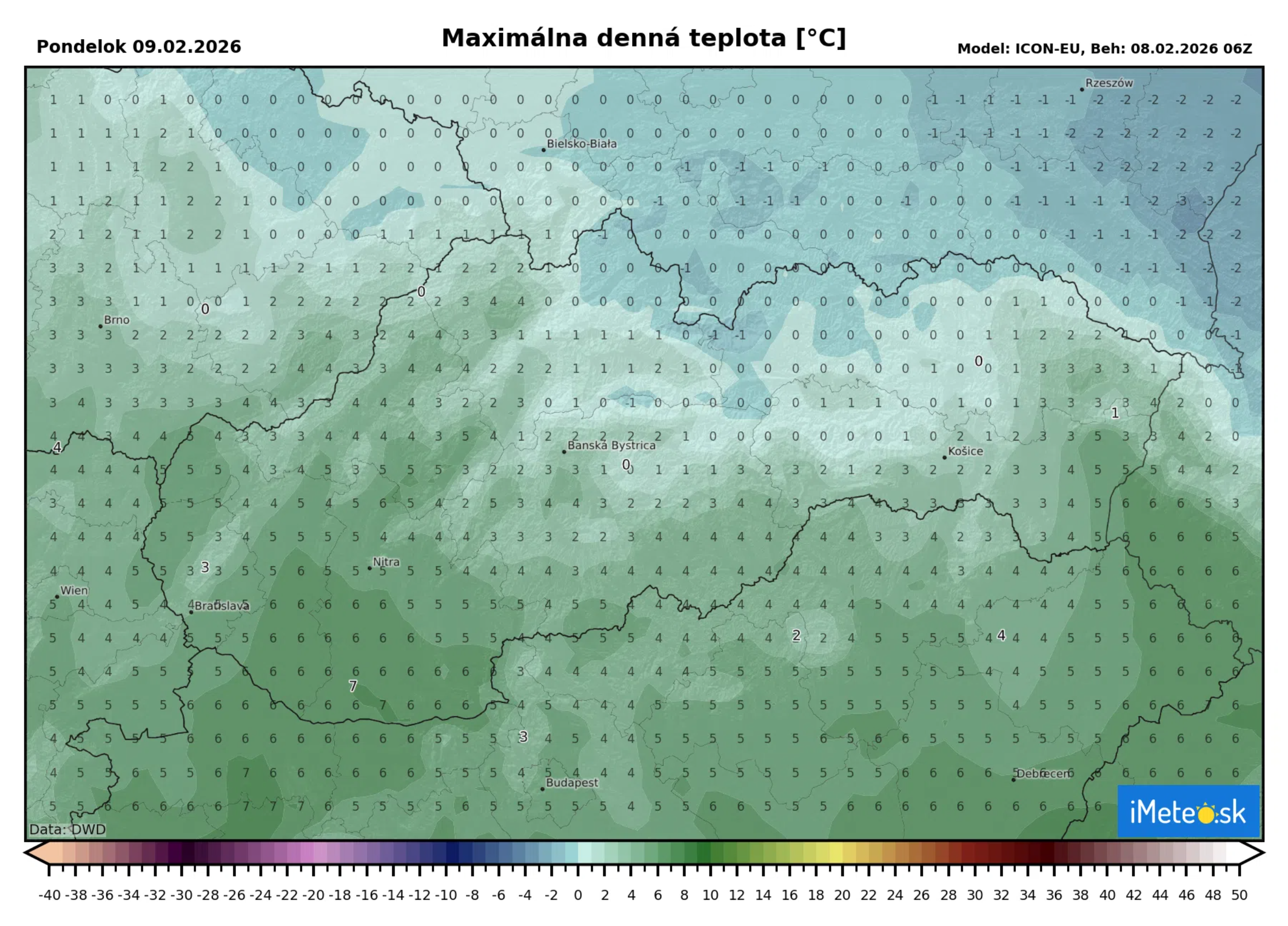 V pondelok už bude o niečo chladnejšie než cez víkend, najvyššia denná teplota vystúpi k +3 °C až +8 °C, na severe a Spiši miestami okolo +1 °C. Teplota na horách vo výške 1 500 m n. m. bude okolo -3 °C.
