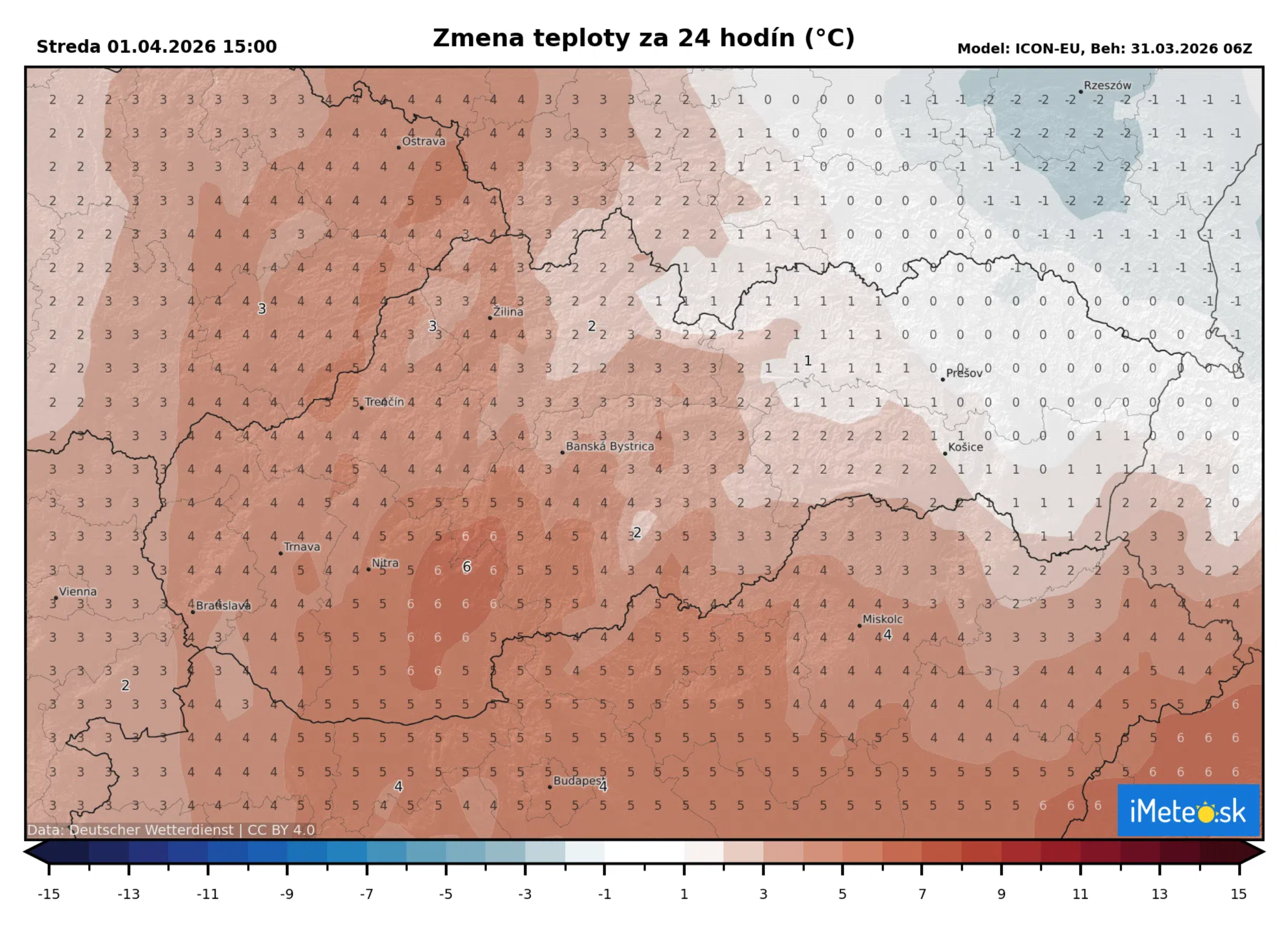 V stredu bude oveľa teplejšie než v posledných dňoch, miestami môže rozdiel teplôt za 24 hodín dosahovať až 6 °C. Najvyššia denná teplota vystúpi k +8 °C až +14 °C, v Žilinskom, Prešovskom kraji a na Dolnom Spiši väčšinou k +2 °C až +8 °C. Teplota na horách vo výške 1 500 m n. m. bude okolo -2 °C.