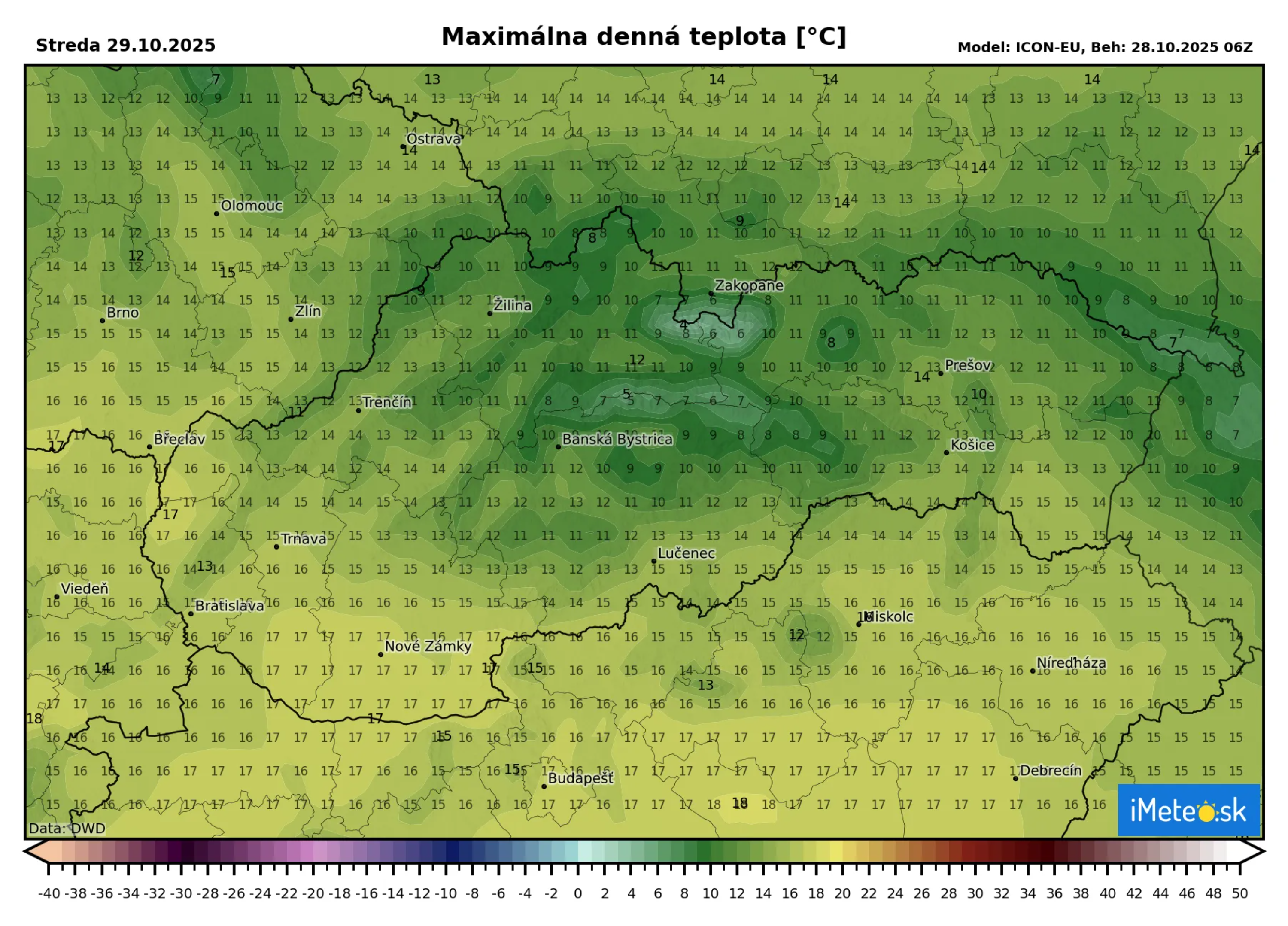 Najvyššia denná teplota vystúpi k +13 až +18 °C, na Orave a pod Tatrami okolo +11 °C a na horách vo výške 1 500 m n. m. okolo +6 °C.